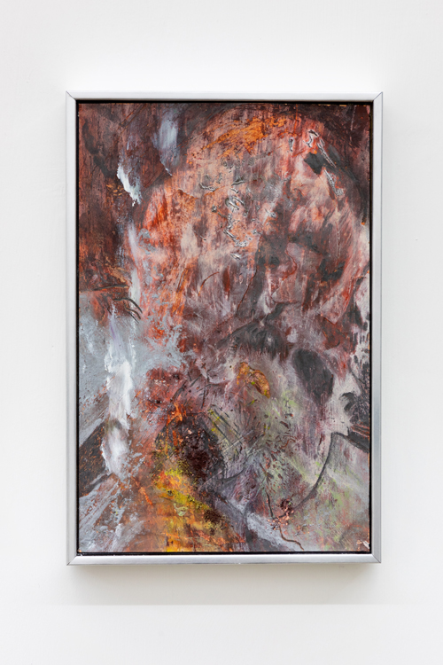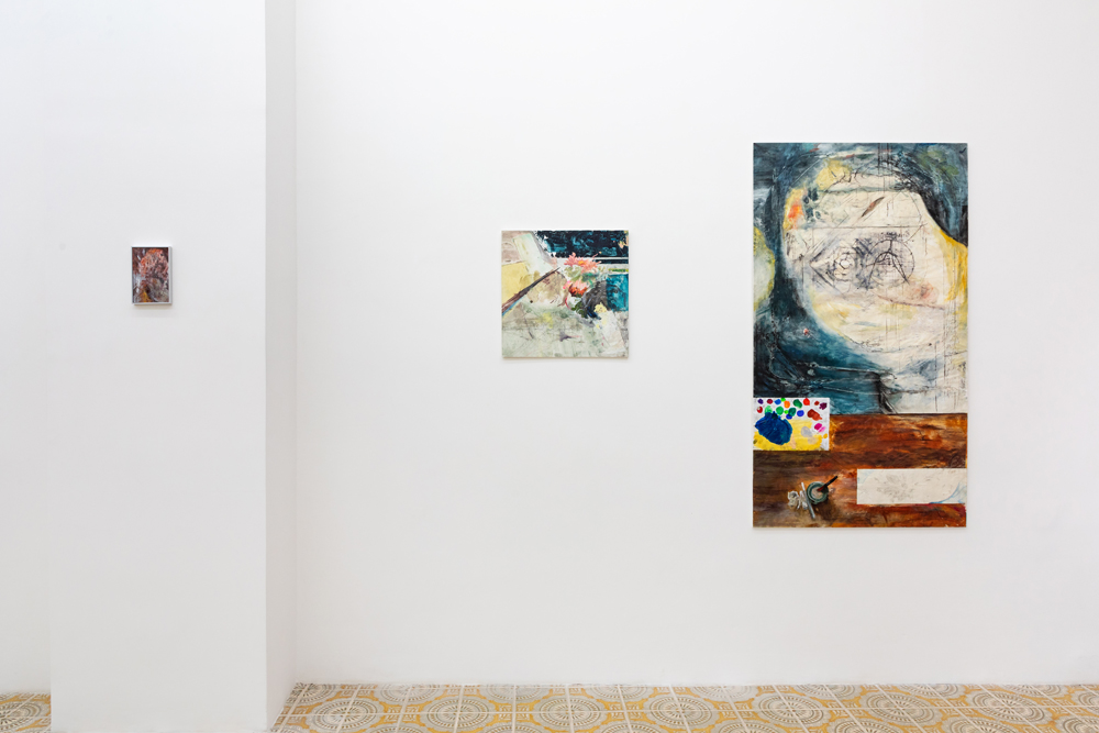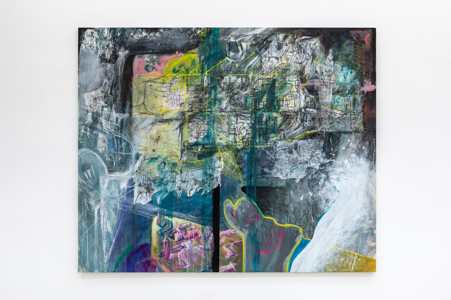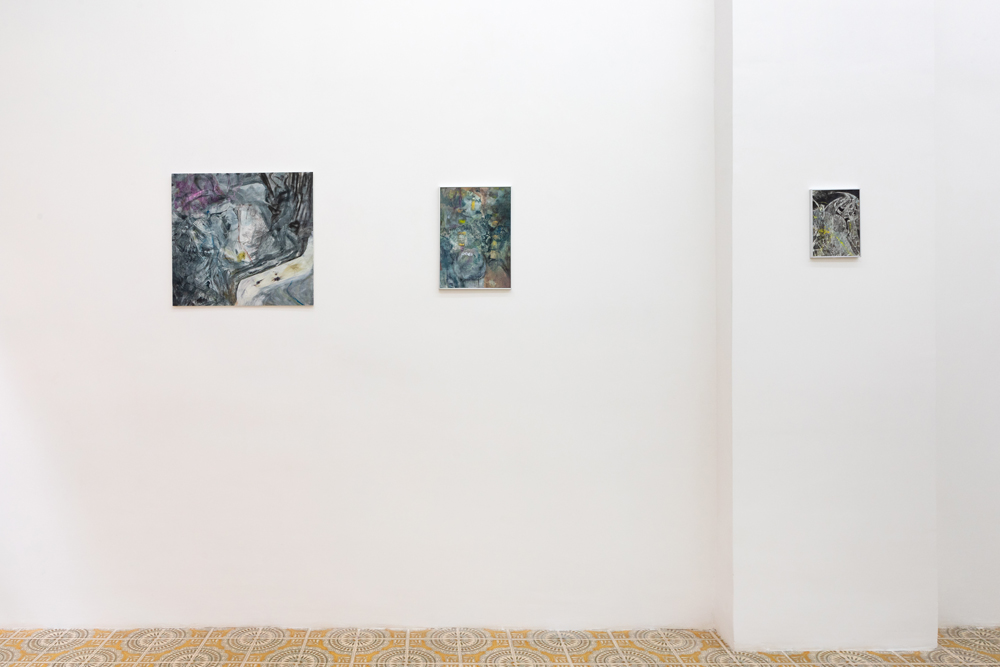 Ça va sans dire: tradurre vale sempre come tradire e sono proprio questi scivolamenti che Andrea Bolognino fissa indelebilmente su una superficie significante. L’accogliente ambiente unico della Galleria Acappella di Napoli, che presenta la seconda personale dell’artista nato nel 1991, viene così saturato da una serie discontinua di errori su tela o carta, ridondanze mnemoniche o ambientali rimandanti a qualcos’altro di indefinito. Seducenti e fatali, questi bug nelle routine organiche si sovrappongono strato su strato, tra offuscamenti e luccicori, andando a comporre, sul fondo di quel sublime inganno della rappresentazione piana, una indistricabile stratigrafia di visioni più o meno periferiche, latenti o retiniche, spesso notturne oppure aurorali, quando ogni cosa può cadere più liberamente nell’altra.