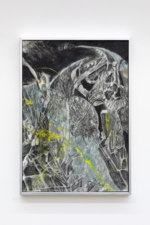 Come già in altri momenti della sua ricerca, Bolognino manipola con sicurezza e sincerità le diverse gradazioni dell’inesattezza, del malinteso, del difetto rifrattivo e focale ma anche dell’incongruenza materica, restituendole attraverso una linea preziosa e risuonante di sensazioni epidermiche. Così, tra le opere in esposizione da Acappella si seguono le tracce di uno stupore destabilizzante, similmente a quanto si può ritrovare al cospetto di certe Pitture nere di Francisco Goya, come Atropo, Visione fantastica e Duello rusticano, per la serena e feroce incoerenza attraverso la quale sfondi e figure arrivano a distendersi su un unico piano, contraddicendosi senza alcuna mediazione, come lacerti di memorie sfuggenti, suggestioni letterarie e impressioni sovrapposte.