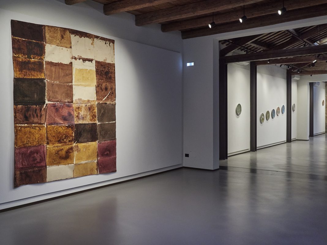 Cromogramma è la grande tela di Renata Boero che apre la mostra. L’opera è datata nell’arco di cinque anni, dal 1965 al 1970, periodo in cui l’artista si dedicò alle sperimentazioni pittoriche frutto di mutualismo con materiali ed elementi di origine naturale per riscoprire il portato simbolico dei colori come parte integrante dell’essenza della pittura. I Cromogrammi, infatti, si presentano come griglie regolari di varia tonalità, celando il processo artistico di immersione della tela in infusi ricavati dalla manipolazione di fiori, erbe e spezie. La piegatura della tela e la sua decantazione fanno sì che sia il tempo ad agire e intervenire in quella che, in ultima analisi, è rappresentazione del procedimento di creazione, e non mera riproduzione della natura.
