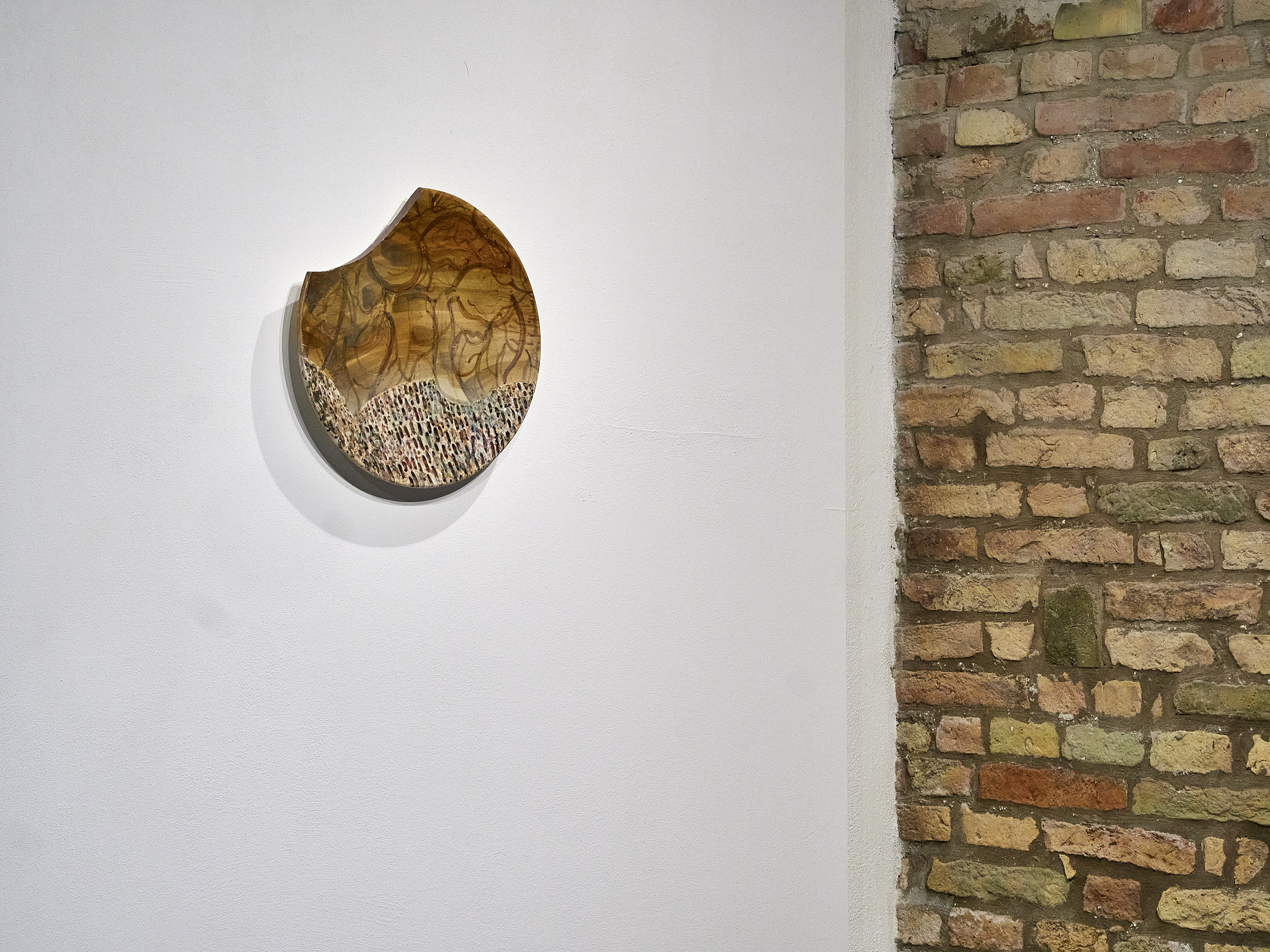 Interessante sottolineare l’aspetto dell’allestimento in particolare per le ceramiche di Alessandro Roma i cui dieci lavori costitutivi si allineano sullo spazio a parete come in una descrizione di fasi lunari. Ecco qui evocare, ancora una volta, la concezione del tempo, filo sottile che riunisce le opere in mostra scandite da un tempo di cura, un tempo di accettazione e un tempo di rinascita. I piatti in ceramica di Roma, in questo caso, non sono solo manifestazione della ricerca spontanea ed errante di una propria percezione della natura, ma sono anche rappresentazione di un evento reale di distruzione-creazione. I manufatti presenti in mostra in effetti sono stati salvati dall’alluvione dello scorso maggio, trovati a galleggiare presso il laboratorio Ceramiche Lega di Faenza. Sono quindi stati sottratti al cataclisma praticamente incolumi se non per un unico piatto scheggiato, la cui ferita diviene appropriazione da parte dell’artista che accetta e rilegge un trauma in un divenire altro.