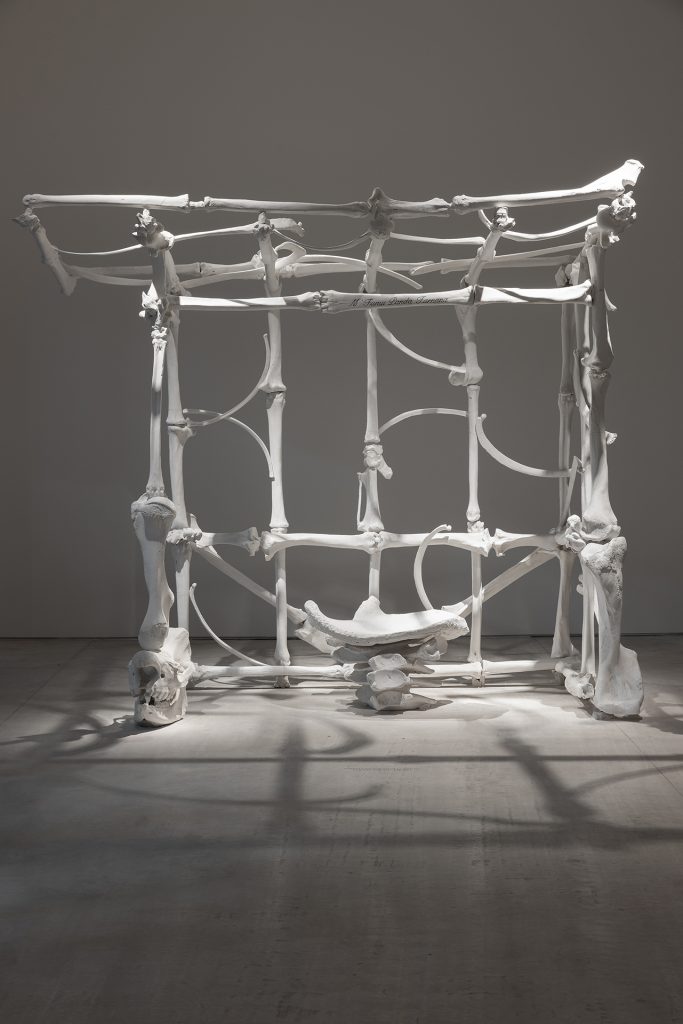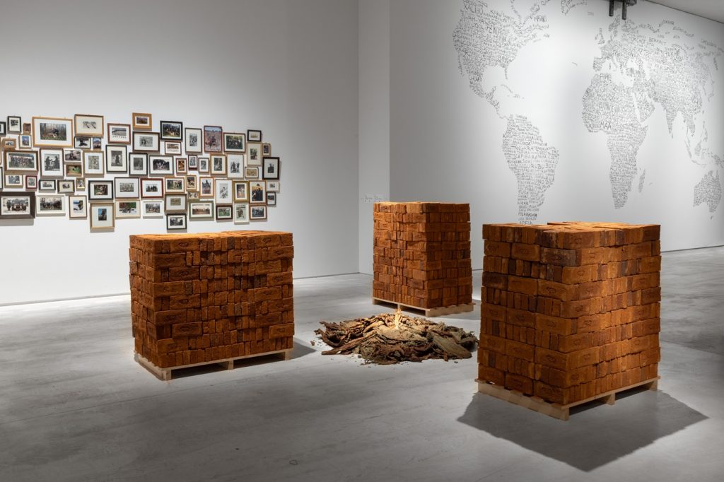 La mostra è stratificata e si sviluppa su cinque piani del museo, in un percorso organico radicato nello spazio profondo del piano interrato che inizia con M’Fumu di Elisabetta Benassi, una visione in forma di attesa che incrocia immaginazione, passato coloniale e nuove geografie urbane. La grande installazione – uno scheletro che ripropone una versione fittizia di un non-luogo, la Linea 44 del tram di Bruxelles – prende forma con la giustapposizione e l’incastro di alcuni calchi in gesso di ossa animali provenienti dal Museo Reale per l’Africa Centrale, dove il tram si ferma, innescando una relazione simbolica tra spazi e tempi e, in particolare, con la collezione del museo. Quest’ultimo è stato costruito con l’intenzione di esporre le depredazioni coloniali dello Stato Libero del Congo, durante le quali dieci milioni di congolesi furono uccisi. Inserendosi in questa complessità, l’artista ha scelto come titolo del lavoro il nome africano di Paul Panda Farnana, intellettuale e attivista congolese a cui rende omaggio, ristabilendo una nuova memoria verso le soggettività ai margini, cancellate o dimenticate.