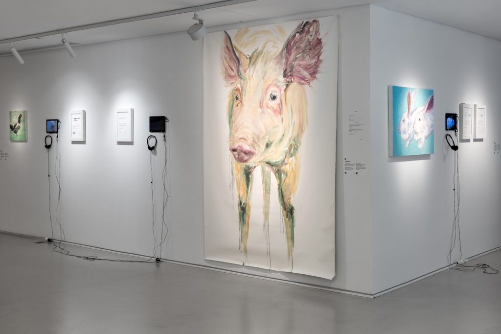 Attraverso la costruzione di un immaginario radicale che investe ogni aspetto del suo quotidiano, Pers è impegnata giornalmente nella cura degli animali non umani ospitati nel santuario-residenza RAVE East Village Artist Residency, meta-progetto partecipativo fondato insieme alla sorella artista Isabella Pers. In mostra è presente un consistente nucleo di lavori appartenenti alla serie in divenire Art History, attraverso cui l’artista ha salvato negli anni più di 300 individui, molti dei quali hanno vissuto nell’ecosistema multispecie di RAVE prima di trovare adozione. La pratica militante di Pers si muove dalla denuncia delle atrocità della sperimentazione animale, come nel caso della serie pittorica The Sleepless Monkeys dipinta in uno stato di privazione del sonno, estendendosi alla lotta in piazza (sono presenti in mostra i cartelli portati a Milano e Roma in occasione della mobilitazione nazionale Giù le mani dai Santuari!) e alla possibilità di responsabilizzare l’umano nel suo quotidiano, con un gesto semplice ma rivoluzionario.