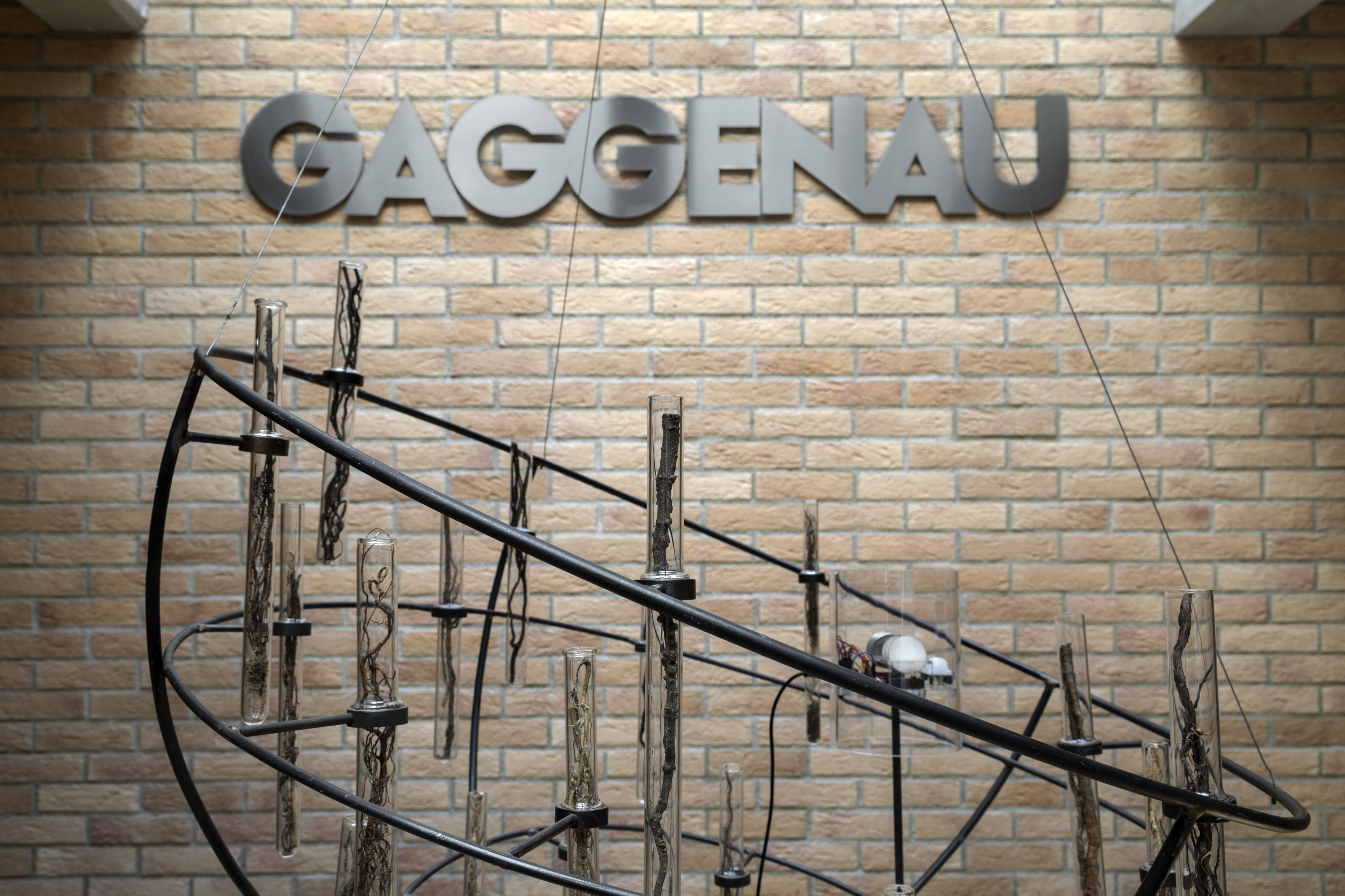 Se il profumo di Daimon inizia a condurre verso un contatto profondo con la natura, un profumo sciamanico e completamente naturale, poco distante sulla destra sono tre opere – Prigionia di profumo – a ravvivare la necessità di un rigenerante contatto con la natura attivando ulteriormente l’olfatto. Repetto ha realizzato queste opere in uno dei momenti più bui della storia recente, la pandemia, quando persino l’incontro con la natura era impedito. Cortecce, aghi di pino, piume, radici, danno forma a una natura desiderata, che all’interno della cloche danno forma a una visione incantata e sospesa tra saponette e componenti elettronici. Cosa succede alzando la cloche? Si respirano, tre profumi differenti che ripristinano un contatto tattile e olfattivo ponendo fine a qualunque impedimento, fisico o immaginifico che sia. Sulla sinistra di Daimon invece è esposta Meccano, opera site-specific che Repetto ha realizzato appositamente per lo spazio di Gaggenau nella forma di tre cubi, ciascuno dei quali ha un’apertura centrale da cui si diffondono diverse fragranze, trasformando la materia greve in qualcosa di leggero e dinamico.