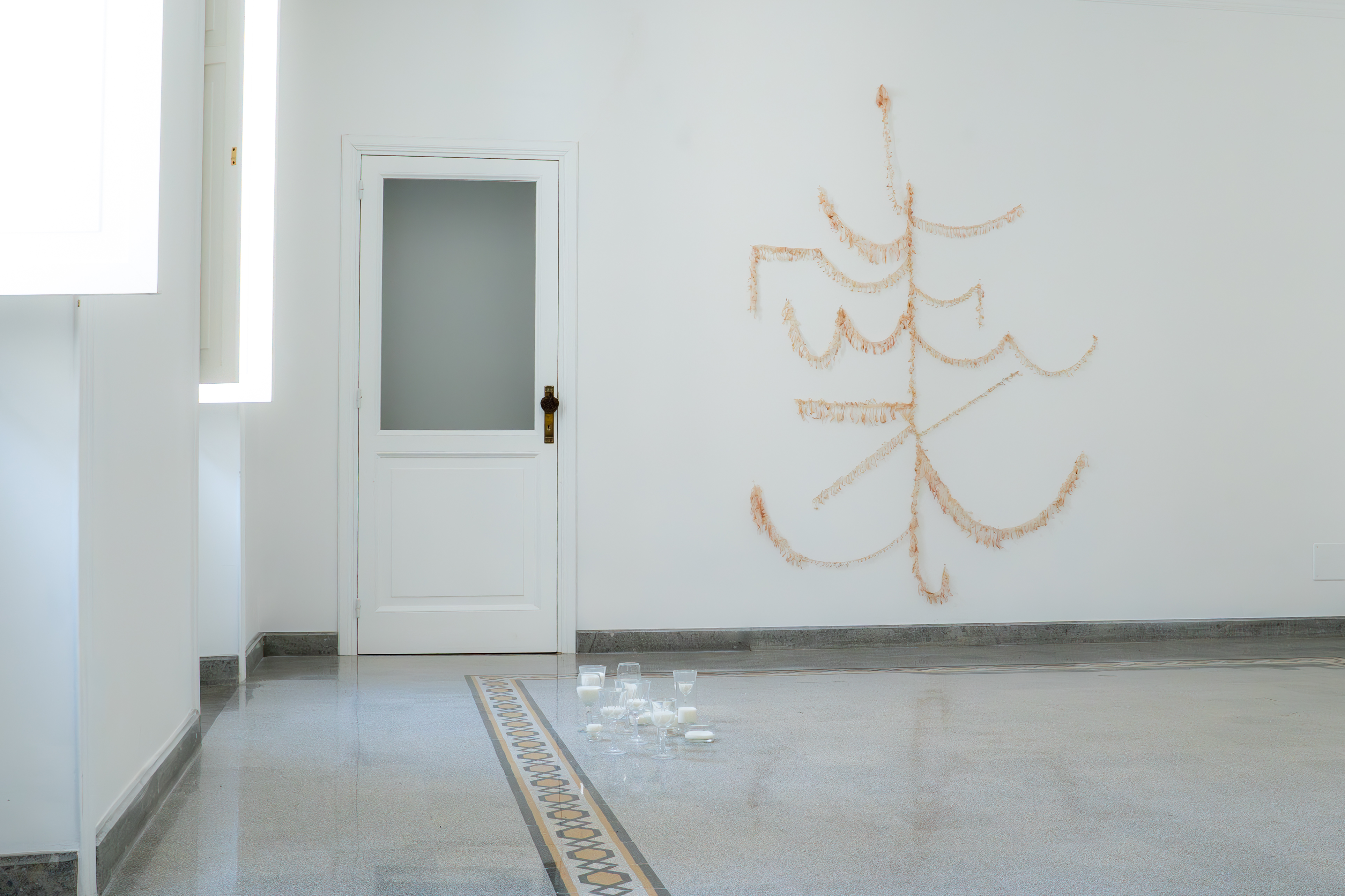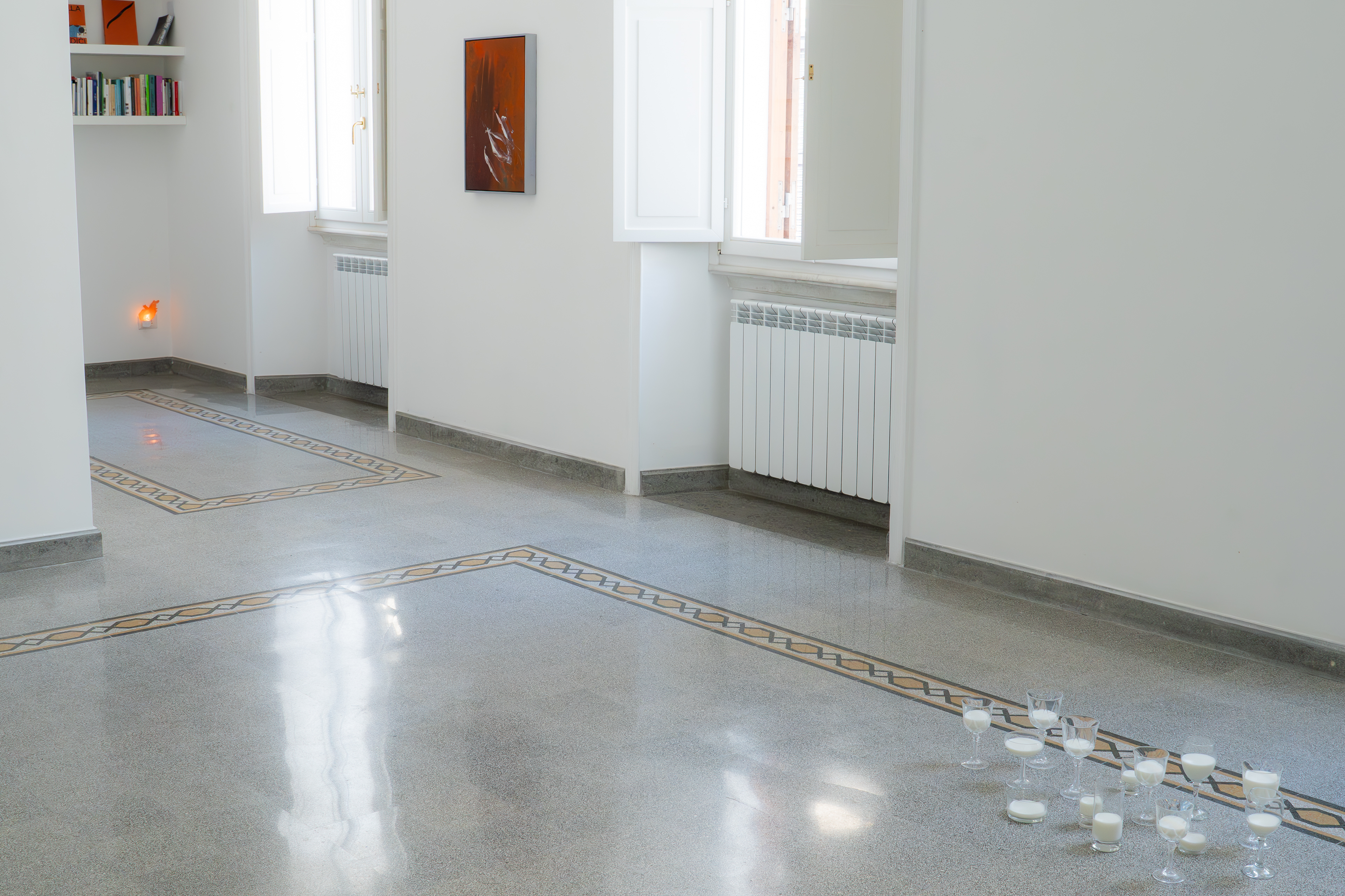 Un primo giro dell’appartamento restituisce una sensazione di calma piatta, un’atmosfera distesa, delicata. Uno sguardo superficiale delle opere, che senza leggere il foglio di sala, ti fanno pensare a temi consueti: memoria, ricordi, storie di famiglia. Si presentano oggetti archetipici come una pelliccia, una kefiah, foto di famiglia; materiali come luce, seta, latte, pietra; suoni come i canti gregoriani.