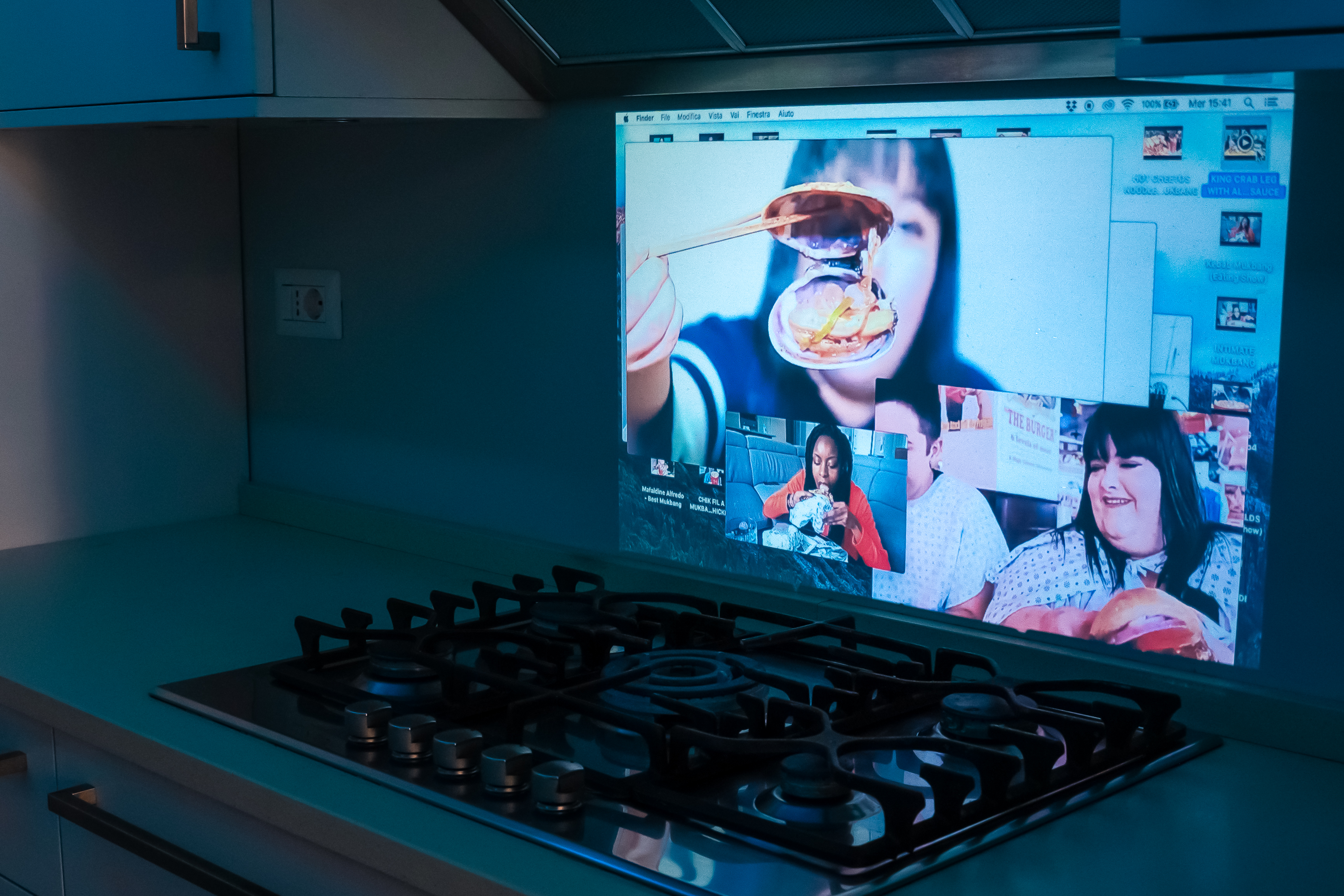 Infine, nella cucina di IUNO, trova spazio il lavoro di Giulia Crivellaro, in cui il processo di straniamento, talvolta apertamente alienante, raggiunge il suo apice. In A General State of Loneliness (2019), l’artista riflette sulle forme rituali del pasto attraverso una registrazione dello schermo del proprio Mac: una struttura a matrioska, visivamente ingorda, in cui si moltiplicano video presi dal web, dove content creator mangiano davanti alla telecamera.