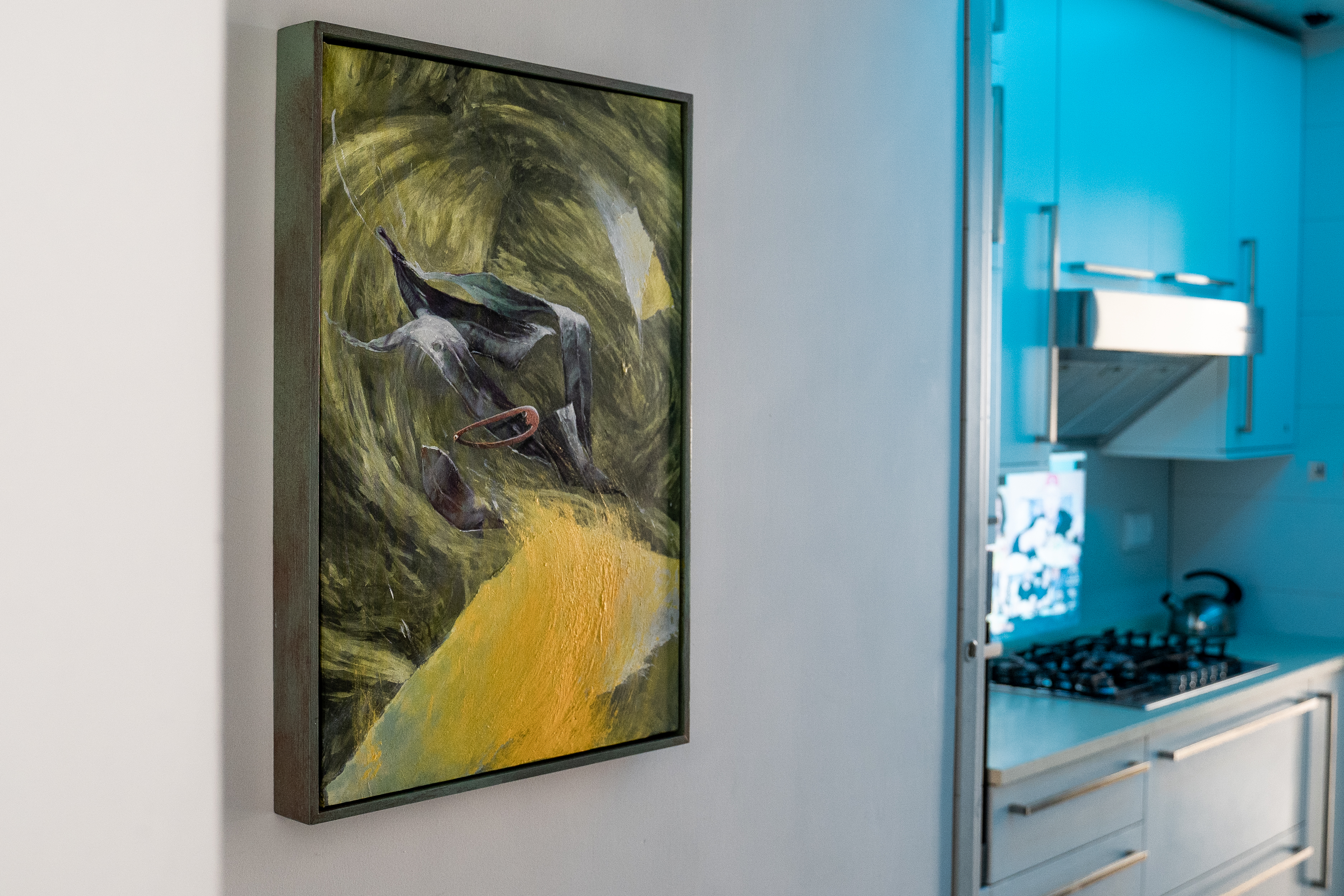 Ecco, dunque, che a un secondo giro dell’appartamento, la percezione di un’atmosfera pacata si altera: affiorano dettagli più dinamici, perturbanti, che muovono le opere verso traiettorie meno eteree. Si presentano sagome mutanti, memorie confuse, ombre, ricordi manomessi, evocazioni stranianti.
