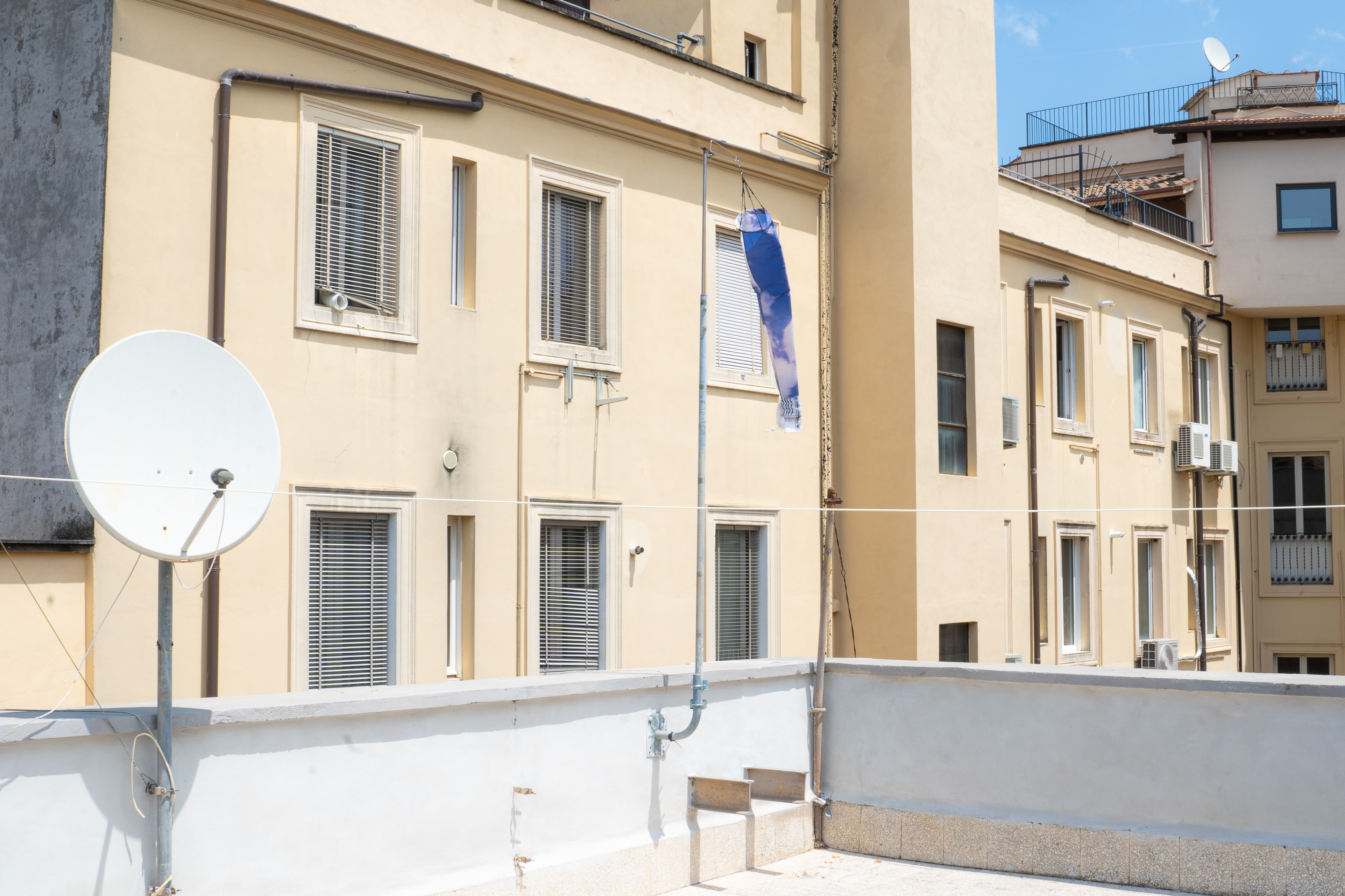 L’esposizione si estende così a tutto lo spazio domestico, anche quando l’appartamento è vuoto e silenzioso, aspetto essenziale dell’intero progetto: tutte le opere di The Good Company abitano la casa e ogni installazione si configura come un gesto relazionale. Un artista per una o più stanze (tranne il bagno) e poi anche un’opera in terrazzo, quella di Anemoscopio (2025) di Margherita Morgantin. L’opera si compone di tessuti leggeri e resistenti, sensibili al vento e ai minimi cambiamenti atmosferici: un’istallazione ambientale in cui forme e sorti sono consumate e decise dall’ambiente e dal clima. Morgantin lavora anche sul concetto di resistenza portando il suo lavoro a una dimensione collettiva, una parte del tessuto dell’opera, infatti, è una kefiah.