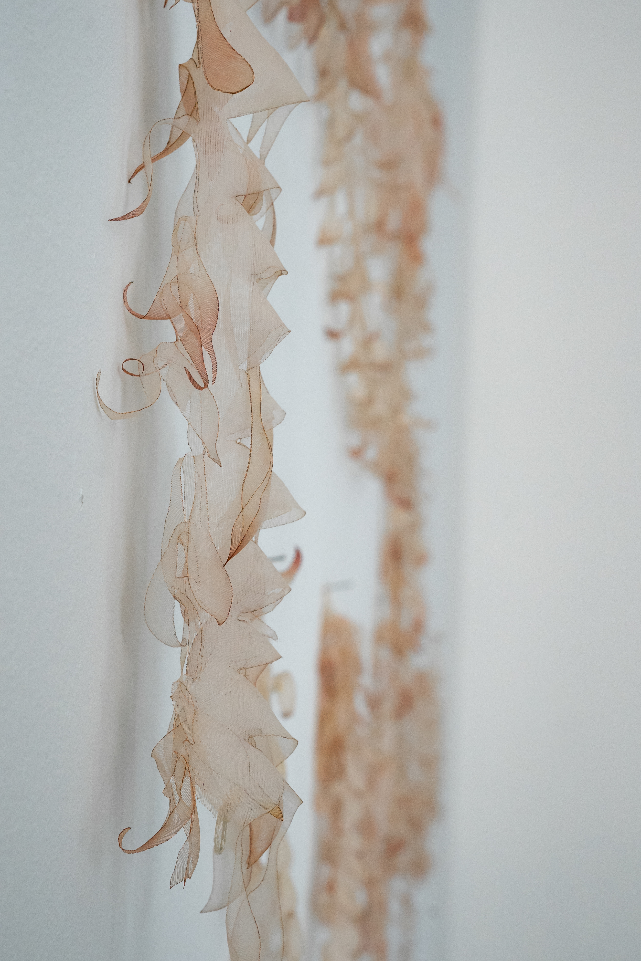Emblema di questa doppia impressione è il lavoro di Jacopo Belloni: Birichino (2023), che si trova nel salone centrale. Si manifesta come una figura fitomorfe, tracciata a parete attraverso una composizione di petali di seta. L’opera riprende l’estetica della tradizione sartoriale teatrale, ma al tempo stesso richiama la logica memetica come meccanismo di trasmissione culturale. Il riferimento al “meme” – inteso non solo come contenuto virale, ma come unità minima di significato replicabile – introduce un campo semantico in cui immagini, storie e forme si trasformano attraverso processi infiniti di imitazione e variazione.
