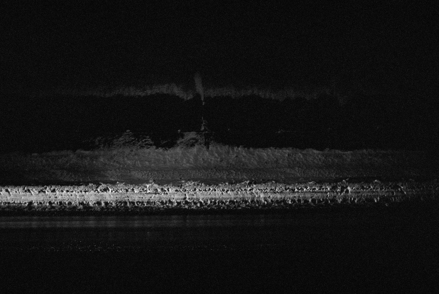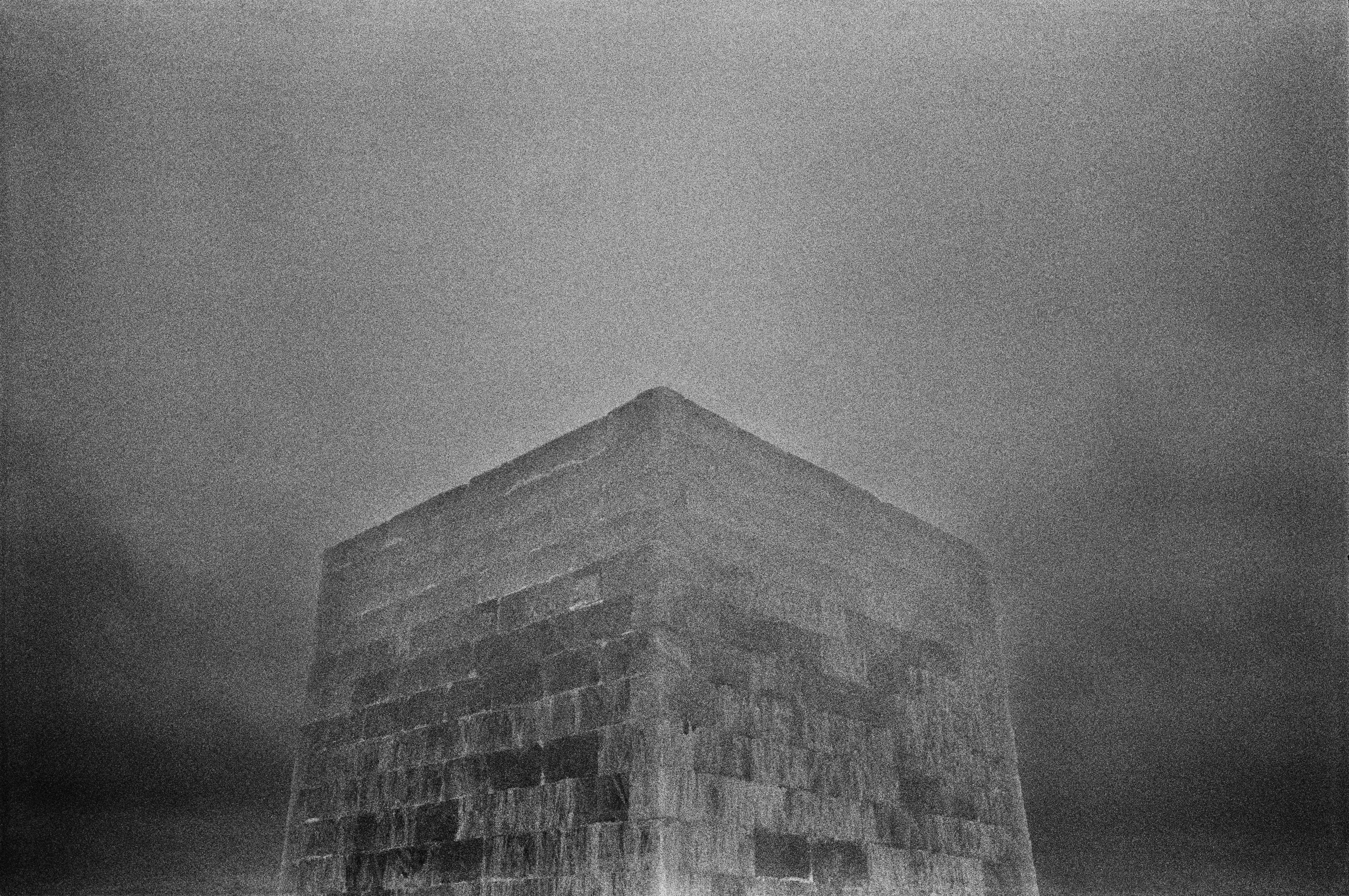 Sebbene però le opere appaiano un passaggio istantaneo della sua esperienza da nomade, chiari riferimenti simbolici ed evocatici sembrano costanti all’occhio dell’osservatore. Segni di luce calcano con urgenza la presenza dei neri più profondi, gli stessi che dalla grana della pellicola analogica prendono corpo. Il riflesso di una donna, come uno spirito, sembra dissolversi fra lo sky-line del paesaggio urbano e dove la neve, ormai ghiacciata del finestrino, sembra velocizzarne il suo sbiadirsi (Autres rivage. Lettonia, 2002); il suo ultimo sguardo lo rivolge incerto e inatteso all’osservatore, il quale distante coglie l’essenza di quel momento fugace. Un monumentale cubo mattonato, nella sua centralità sembra divenire totem divino di un’antica civiltà e dove quel cielo nebuloso che lo inquadra ne evoca la sua presunta sacralità (Autres rivage, Finland, 2004).