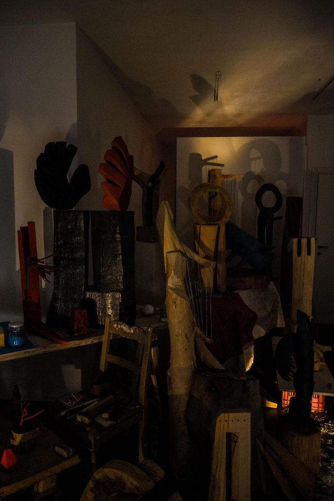 La trasformazione in luogo liminale, sospeso tra atelier, archivio e spazio espositivo, che lo spazio subisce grazie a questa installazione, costituisce un ambiente instabile, non fissato in una forma definitiva e in cui gli oggetti sembrano oscillare continuamente tra ciò che erano e ciò che sono diventati: tra strumento, opera e frammento di racconto, restituendo una sensazione simile a quella del sogno, uno spazio in cui basta spostare lo sguardo perché l’insieme si ricomponga in una configurazione del tutto differente.