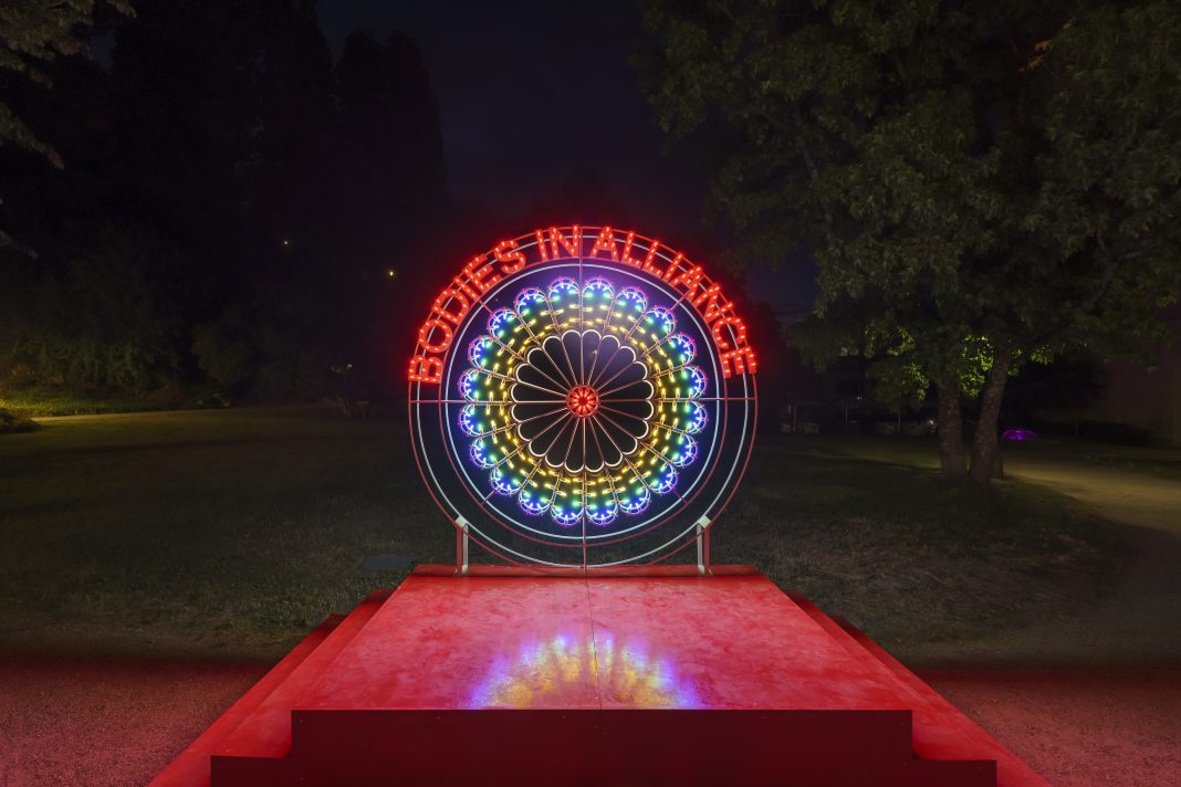 Il fulcro della mostra è una delle celebri “luminarie” dell’artista, prodotta e progettata specificamente per la facciata del Kurhaus, ma non solo. Da sempre, il coinvolgimento del pubblico è un tema centrale nella pratica di Senatore. Al centro del Kurhaus Kolonnaden, l’artista preparerà un palcoscenico per la comunità: in occasione dei dieci anni della School of Narrative Dance (SOND), il progetto partecipativo itinerante, Marinella Senatore offrirà il palco alla collettività, fornendo ad associazioni, gruppi musicali, singoli e gruppi di danza uno spazio creativo collettivo. Infine, l’opera d’arte “Bodies in Alliance” sarà allestita nel mezzo del Kurgarten, accompagnata dalla citazione della filosofa Judith Butler che invita i visitatori ad avviare un dialogo con l’opera e a diventarne parte.