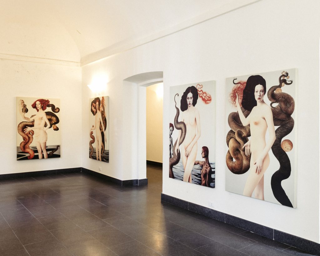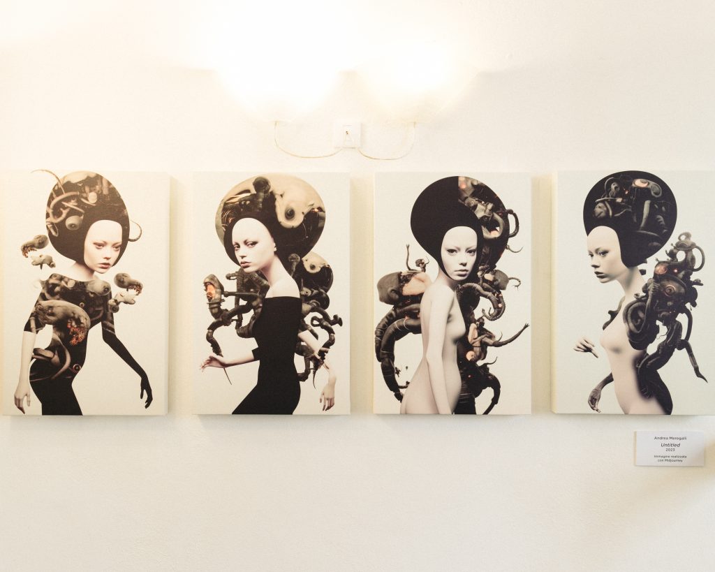 Andrea Meregalli, invece, propone quattro serie ottenute non tramite la digitazione di un prompt, ma grazie alla tecnica del blending. Il blending è una delle azioni che è possibile richiedere alle reti neurali e consiste nell’assemblare e mescolare due o più immagini che vengono fornite dall’autore. Non si tratta di un semplice collage, ma di una vera e propria rielaborazione originale del materiale dato. La particolarità di queste serie sta nel gusto del disgusto: Meregalli associa immagini che consideriamo familiari e tranquillizzanti, come le figure femminili del Botticelli, ad altre più respingenti, come la fotografia di un secchio di acqua ricoperto di alghe o disegni di alieni. Le immagini risultanti, selezionate tra molte, generano una sensazione di ironia amara e di inquietudine, un equilibrio ambiguo tra ciò che ci attrae e ciò che ci respinge. Particolare è la scelta, quasi politica, di stampare le opere su tele di grande formato: un richiamo all’attenzione in un periodo storico in cui siamo sottoposti a una sovrabbondanza di immagini, su cui raramente ci soffermiamo osservandole con cura.