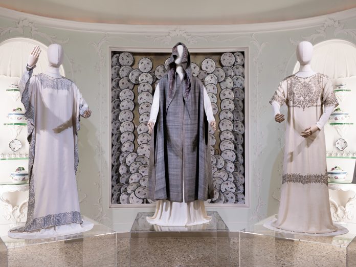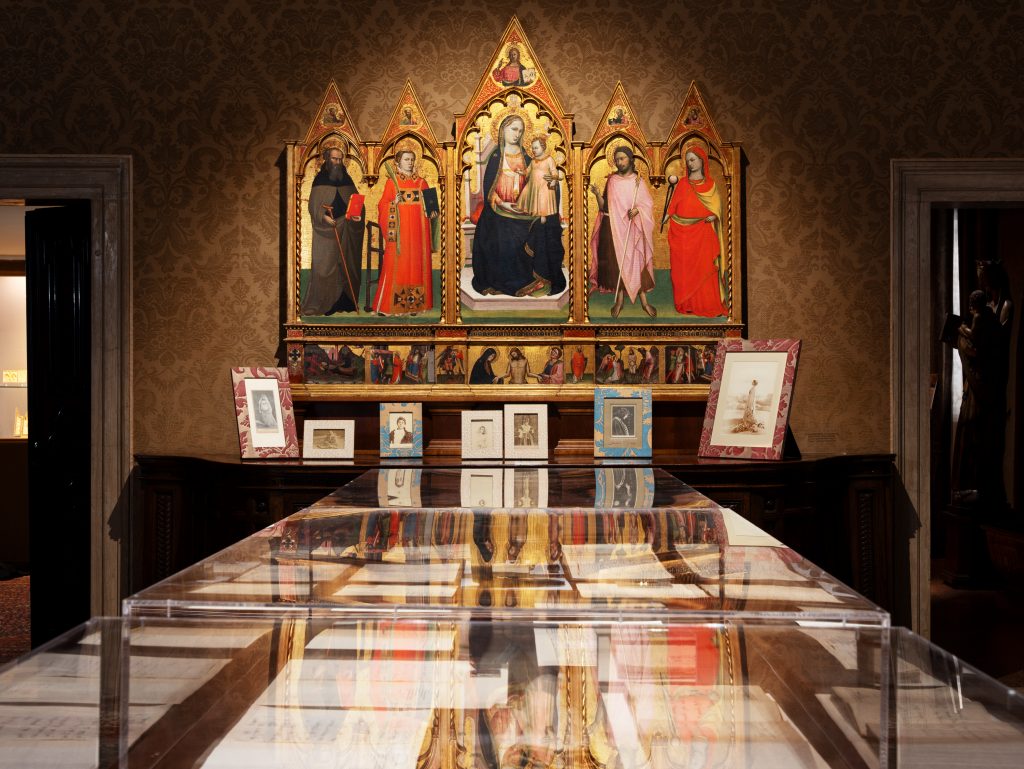 Bellissimi, poi, i costumi di scena, dolcemente illuminati tra le vesti trecentesche delle Madonne, che sembrano spiare le stoffe preziose dalle pareti. Tra questi, figura anche un lungo, raffinatissimo abito in crespo di seta realizzato da Jean Philippe Worth e mai esposto in precedenza.