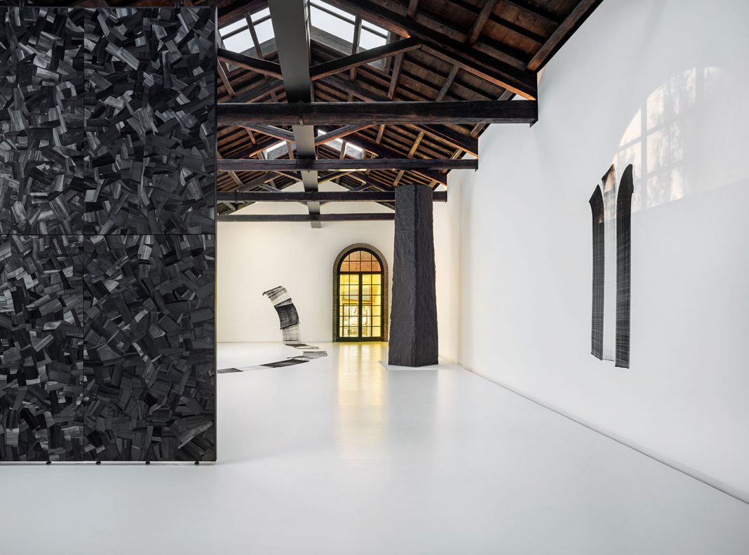 Guardare la mostra senza essere in possesso di queste informazioni è rischioso; l’ambiente principale si presenta scarno, luminosissimo, intervallato da magri segni neri e una scultura megalitica. Tutto assume un senso preciso nell’istante in cui ci si accorge che le decine e decine di metri quadri dello spazio, compreso il pavimento, sono foderate di carta Fabriano, e che le opere esposte non sono altro che la fuliggine di Cheongdo, modellata e ricomposta per render partecipi gli ospiti di un flusso energetico sino ad ora sconosciuto.