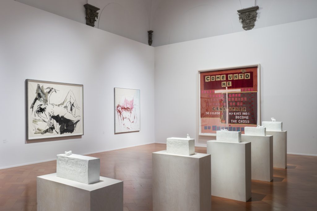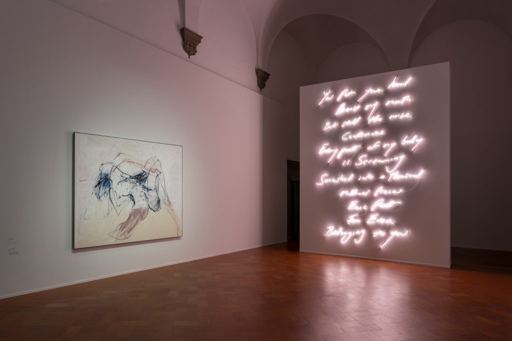 La prima sala della mostra è inondata dalla rosea atmosfera del neon Love Poem for C.F. (2007): la scrittura calligrafica di Emin dona fisicità alle parole, facendosi immagine. Il neon, pur considerato “squallido”, è parte dell’autobiografia che l’artista porta con sé da Margate, città in cui risiede. La luce è un amplificatore emotivo tramite cui la parola, espressione soggettiva, è proiettata verso l’esterno, per darsi alla collettività. Anche la narrazione del neon Those who suffer LOVE (2009), è cruda, diretta e senza metafore di sorta: in esse emerge il senso dell’amore, legato al desiderio e alla vulnerabilità. Nelle trapunte appliqué leggiamo «I do not expect to be a mother, but I do expect to die alone». La scrittura è un mezzo di autoguarigione e riappropriazione, in un reiterare di temi: la memoria, il corpo, la questione femminile, il senso del tempo. Lo stesso atto del ricamo, legato alla domesticità, è un potente mezzo di sovvertimento: Emin vi lavora per riconquistare una dimensione di sé perduta, un mezzo di comunicazione e produzione artistica potente e terapeutico.