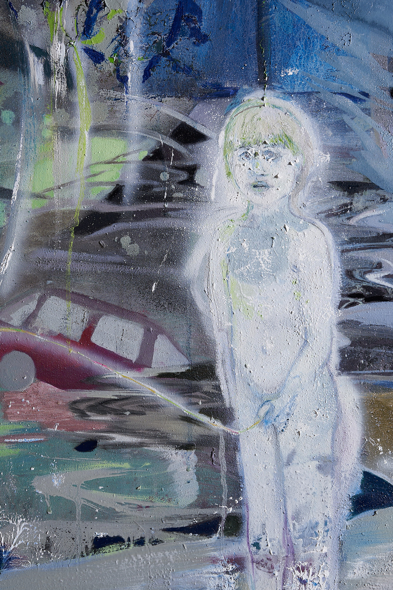 Ritroviamo ad esempio una figura femminile in Holy Pee n.2, 2023 o dei bambini in Il piccolo Noah, 2023 e in 8 agosto, 2023. In No space suite, 2023 possiamo invece vedere l’inclusione sia delle due differenti tecniche artistiche, sia della tematica di realtà e immaginario onirico, cara alla Gelmetti.