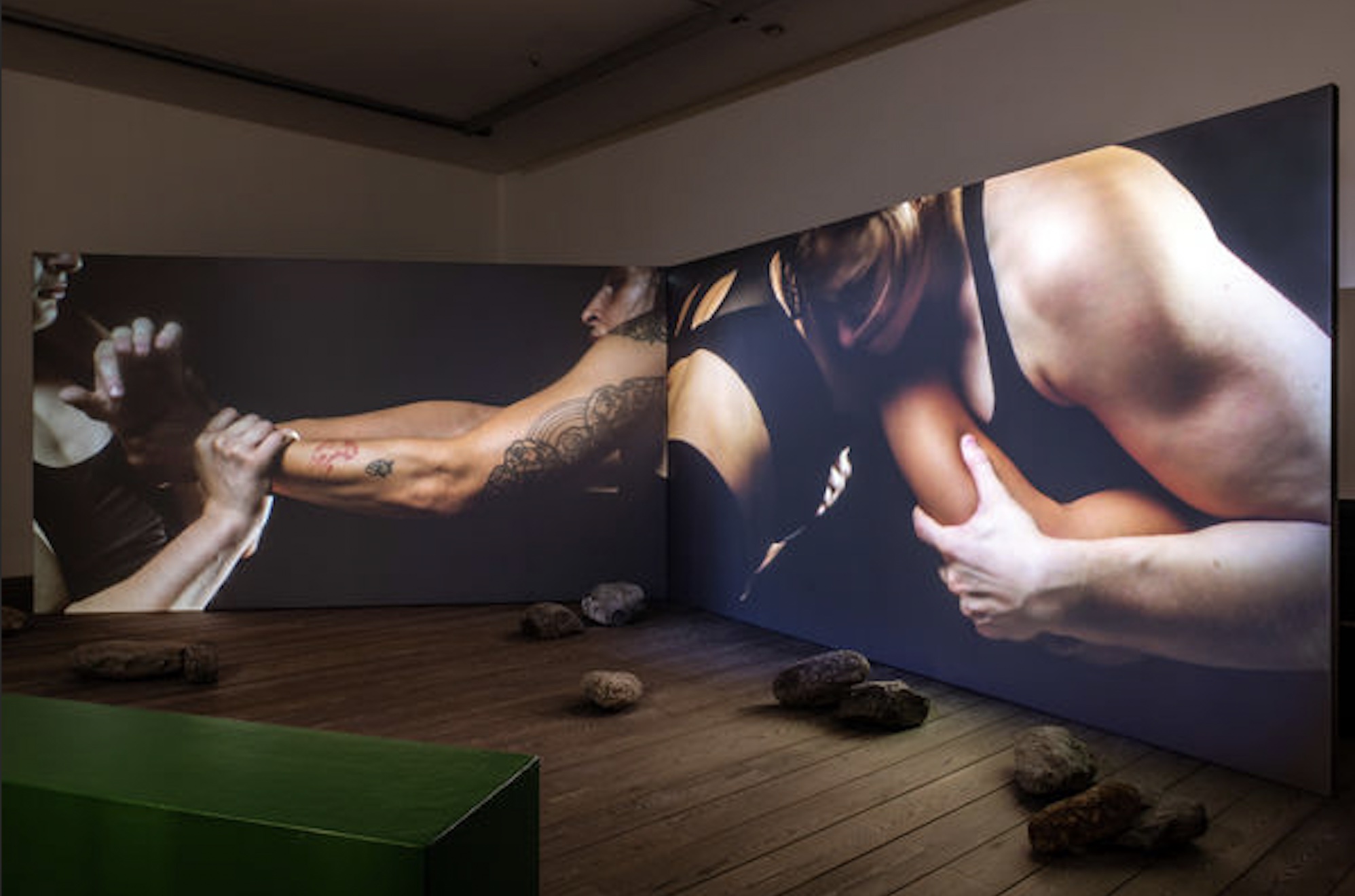 Vermessung. “Von der Lansschaft aus” è il titolo di una delle prime serie di opere che si incontrano lungo il percorso: sono frammenti di mappe geografiche (dell’Impero Asburgico, dell’Alto Adige e dell’Italia del XIX e XX secolo), di dimensioni variabili, che Kazeem-Kamiński ha lavorato con pietre e spilli per farci ripensare alla geografia come luogo di memoria e potere. Ogni spillo, ogni pietra, fissano un punto, ovvero quello in cui le ragazze africane, Gambra*, Schiama* e Asue*, sono state deportate dal sacerdote Niccolò Olivieri. Il paesaggio è così un testimone attivo, e vivo, perché muovendosi attraverso questa critica silenziosa, i suoni e la voce di Rub, Rock, Earth. Throat Clearing richiamano l’attenzione. Il video ci mostra due corpi che si muovono in cerchio, toccandosi in una dimensione di tensione e di continuo cambiamento, mentre la voce narrante, che è dell’artista, si rivolge alle Alpi: sono quei corpi a trascinarci nelle storie di Gambra*, Schiama* e Asue*, che ritroviamo – personificate da tre performer – al secondo piano nel video Nursery Rhymes. (Holy) Water, mentre indossano abiti bianchi e inonano una filastrocca “Roccia, acqua, fuoco, aria. Roccia, acqua, fuoco, aria”. L’opera fa riferimento al battesimo forzato delle tre ragazze (29 luglio 1955, a Brunico) ma Kazeem-Kamiński scuote la narrazione dando alle giovani un ruolo attivo: si chiedono infatti quali peccati abbiano commesso, spingendoci così a pensare anche al potere della sorellanza e alla possibilità di resistere alla cancellazione della propria storia.