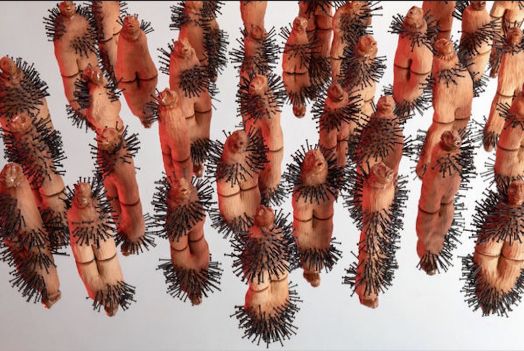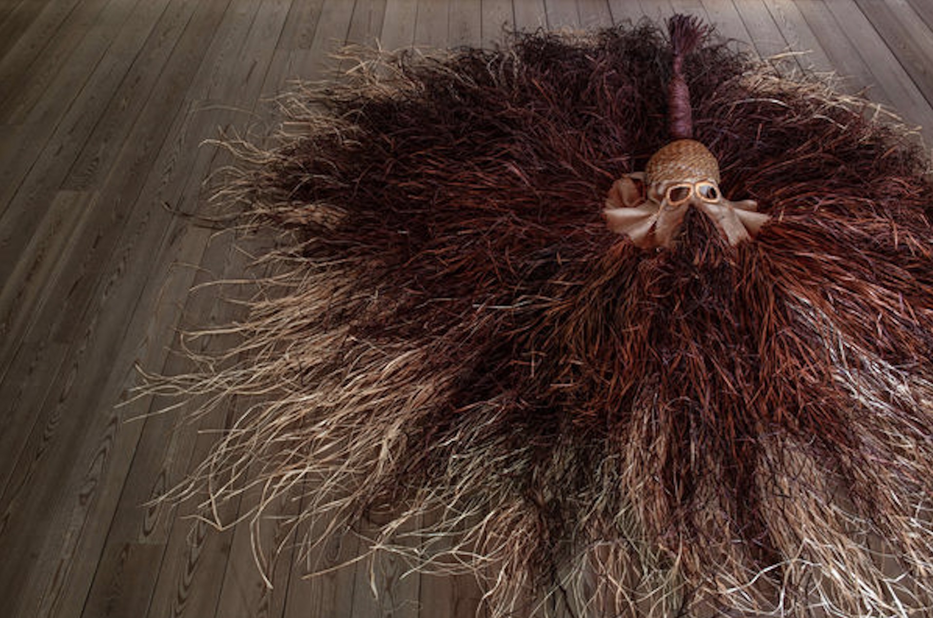 Superando Untitled [Prototype Nkisi / Repurposed Saving Box] – un vecchio salvadanaio per le missioni trasformato in nkisi, ovvero un potente oggetto della tradizione congolese, trafitto di chiodi e lame – e anche Untitled [Lash. Linger. Load/Nkisi] – una serie di nkisi in ceramica in cui sono incastonati chiodi per indicare gli oltre mille bambini rapiti da Olivieri – si raggiunge, al terzo piano, Oya! Fire, un’opera video in cui una figura che indossa una maschera in rafia si muove di un’energia grezza e sfrenata, sembra anticipare una tempesta: è la storia di Asue*, la sua rabbia che viene collegata alla potenza della divinità Oya. Attraversata la stanza, che insieme al video mostra la maschera in rafia, ci si trova immersi in libri, testi e materiali d’archivio che illustrano il contesto di ogni opera. Scendendo l’occhio può cogliere anche tutta la potenza di Aerolectis, che non è solo il titolo della mostra, ma anche di un lavoro site-specific, un lavoro di testo, poetico, che esplora le forze degli elementi naturali incontrati lungo il percorso: la roccia nelle immagini delle placche, l’acqua, il fuoco, con l’impeto della resistenza e della rabbia, e l’aria, potenza della tempesta che sfida chi cerca di cancellare e seppellire una storia.