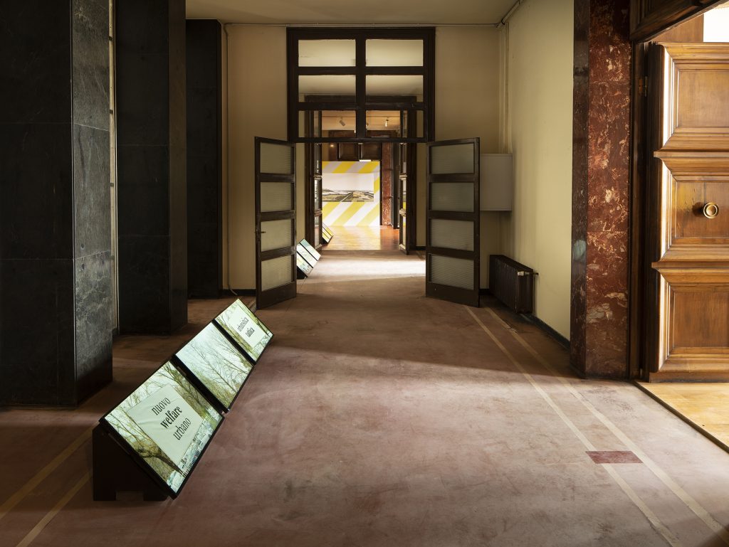 La contemporaneità, dice Molinari, è «rigenerazione, di cui i cittadini sono agenti attivi e trasformatori. La forza del nostro secolo è quella di rigenerare, riuscendo a vedere la città non più come una somma di architetture bensì come un luogo abitato dalle persone». Così lo Shakespeariano «What is the city, but the people?» si concretizza nell’ingresso del Palazzo con l’installazione di Filippo Romano (1969), Geografie Urbane: dodici cittadini, ritratti fotograficamente in scala 1:1, raccontano la città che abitano, i luoghi che amano, le strade che attraversano. La loro disposizione, dinnanzi al grande affresco di Achille Funi, crea uno spazio tra la retorica dell’impegno e le vite delle persone. Non solo questi cittadini, comuni e con i quali possiamo identificarci, danno il benvenuto a chi entra, ma contribuiscono alla ridefinizione della geografia e dei confini della città e all’illustrazione di un immaginario sorprendente, quello di una domesticità urbana, proprio di una città che non appartiene più ai monumenti bensì agli abitanti.