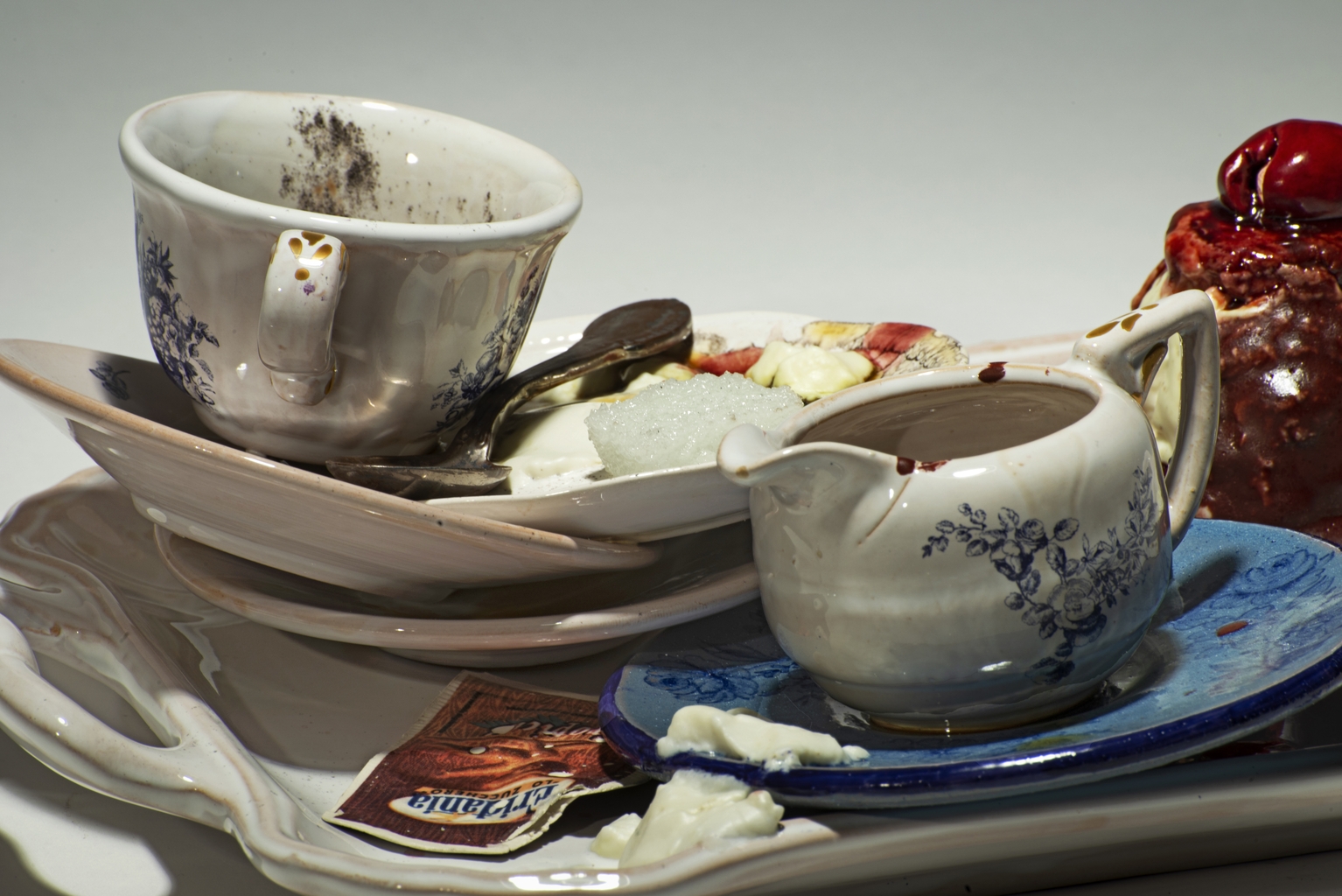 “Sono molto felice della sfida posta a Bertozzi & Casoni – ci confida Maria Livia Brunelli -. Trovo geniale l’idea di ricreare in galleria una vera tavola apparecchiata con tanto di tovaglia reale ma adorna di vassoi e piatti ricchi di prelibatezze realizzati nei più piccoli dettagli in ceramica. Capita spesso che i visitatori che non conoscono la produzione di questi artisti, appena entrati si scusino pensando di aver interrotto un momento di festa… E poi quando capiscono che ogni più piccolo particolare è realizzato in ceramica, rimangono senza parole, strabiliati, e iniziano a toccare la finta polvere, la zolletta di zucchero, i fondi di caffè… E riconoscono i riferimenti a De Nittis e alle tavole ottocentesche nei dettagli decorativi delle tazzine e dei vassoi, nel guanto bianco appoggiato di fianco alla tazzina di cioccolata con la panna. Ovviamente, anche quello in ceramica. Nella seconda sala trionfa una spettacolare orchidea azzurra alta più di un metro, che sembra stata appena estratta dal terreno in cui era radicata, svelando le conseguenze dell’impatto umano sulla natura, ma anche la forza stessa della vegetazione di rigenerarsi di continuo”.
