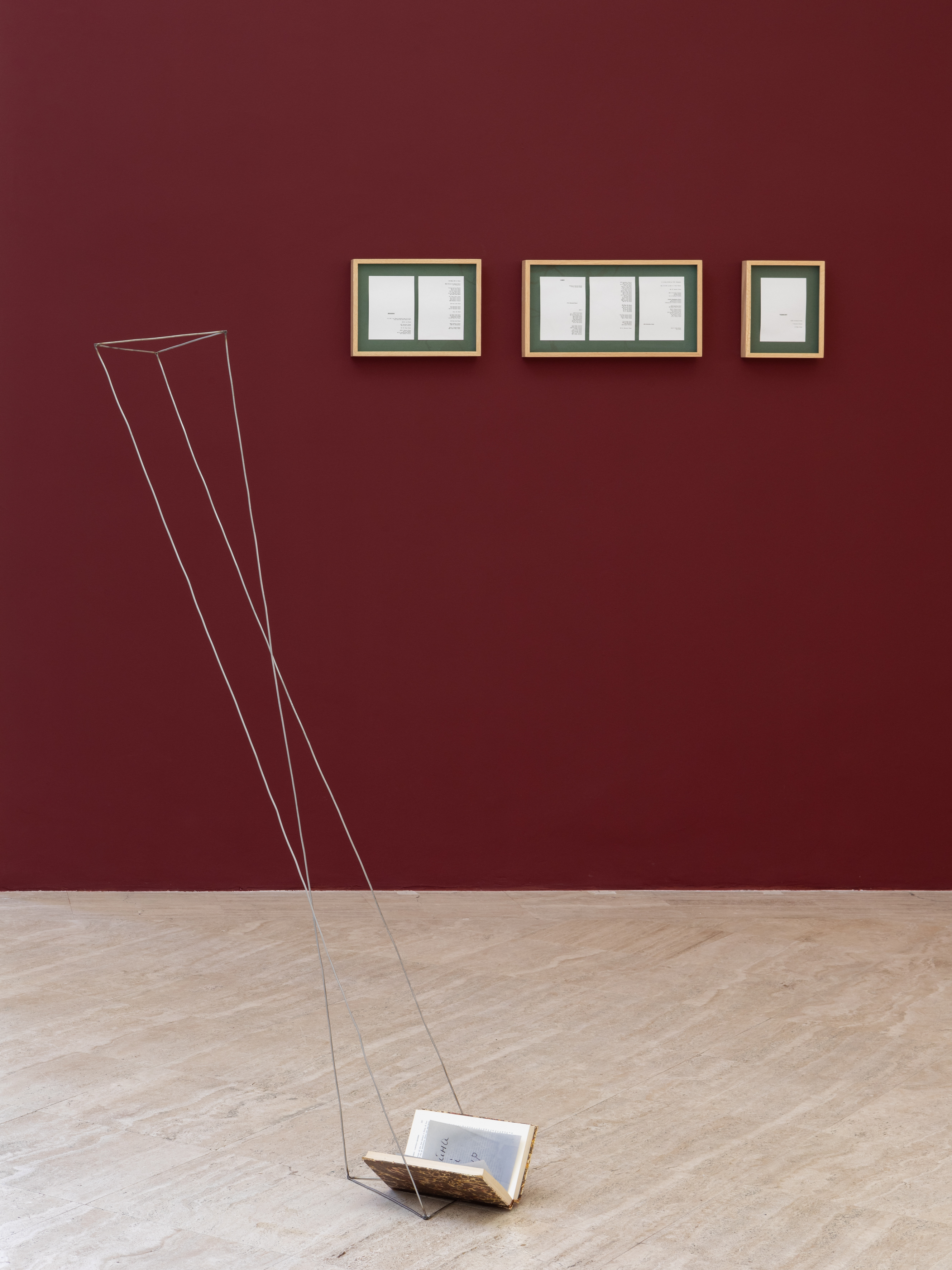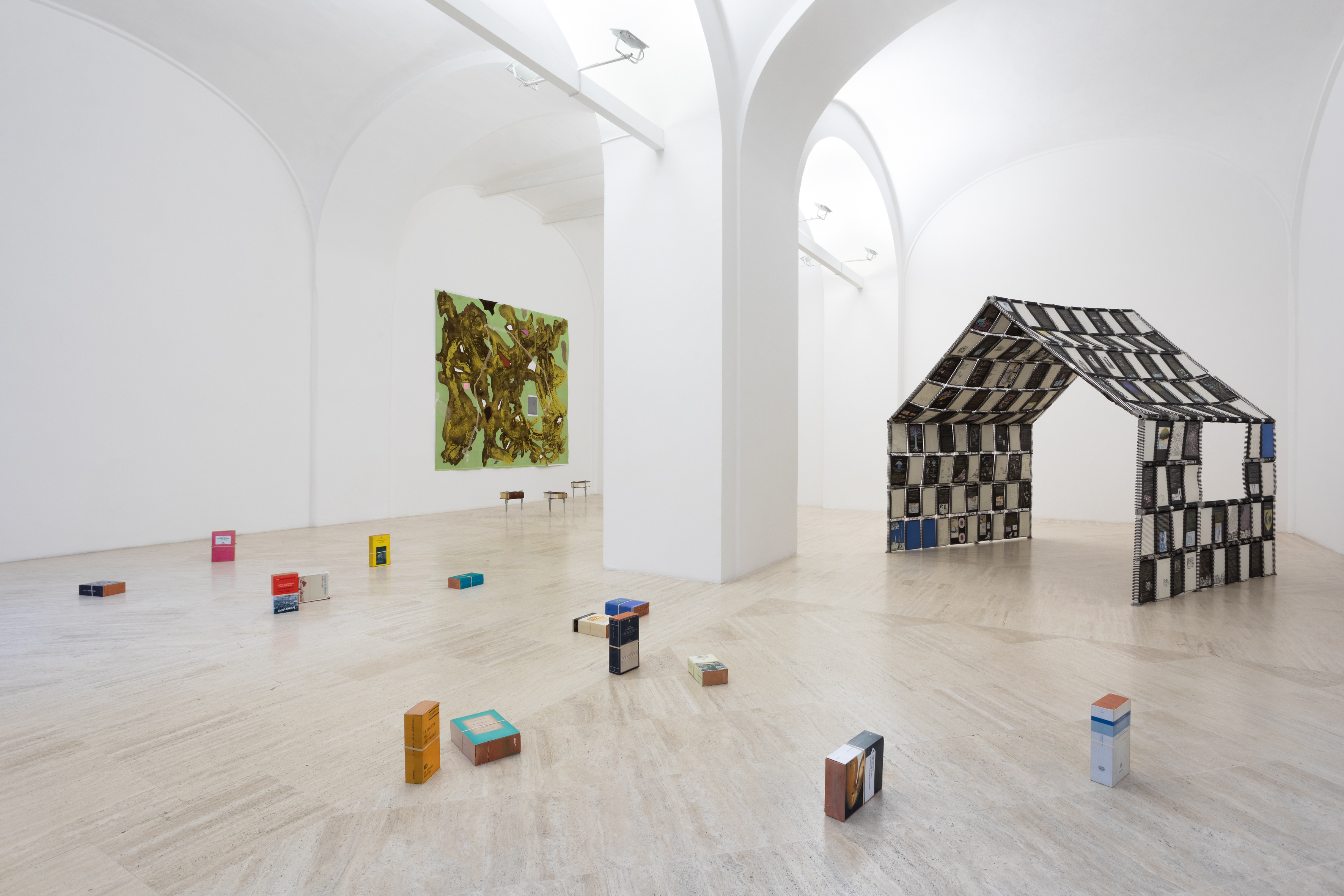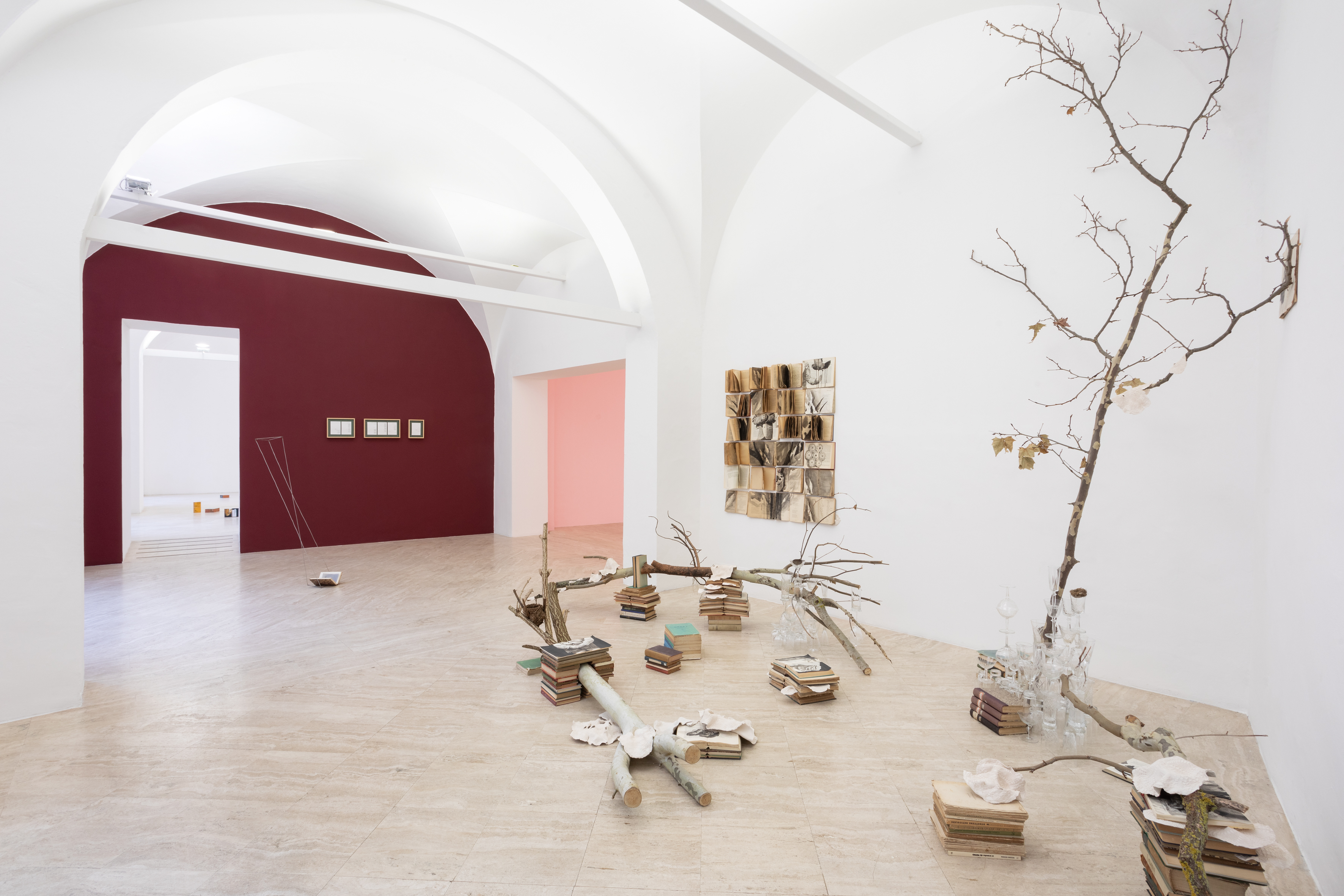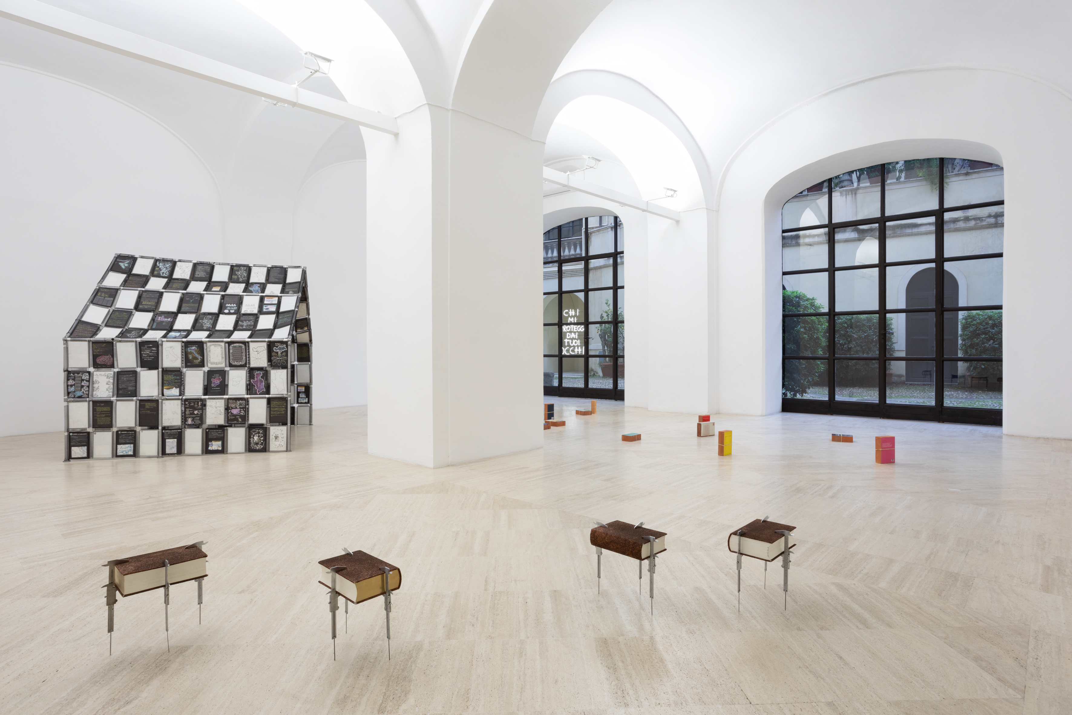 Se in Equilibrio di Paolo Icaro (1936, Torino), il libro è perno centrale e veicolo di un messaggio politico e filosofico, le sculture site-specific di Francis Offman (1987, Butane), cinque volumi coperti da uno strato di caffe e sorretti da calibri, evocano questioni etniche e identitarie. E, a proposito di identità, riflette anche Nicolò Degiorgis (1985, Bolzano) con l’installazione Heimatkunde. Una casetta costruita con quaderni fitti di mappe geografiche, appunti, schemi. In Alto Adige, infatti, fino agli anni Novanta del ‘900, i piccoli venivano stimolati a costruire la propria individualità a partire dalla scoperta del territorio circostante.