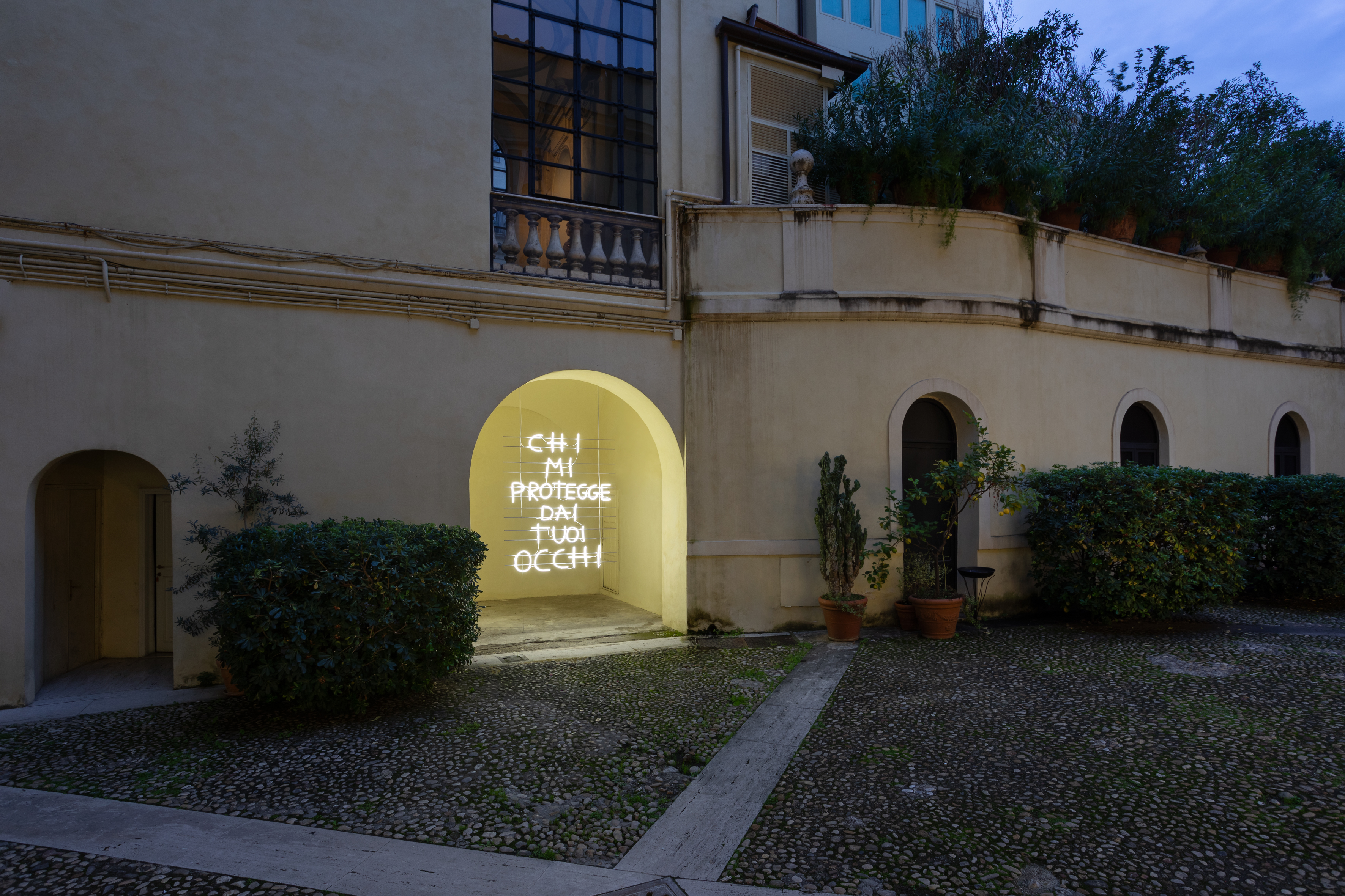 Aprono e chiudono l’iter espositivo gli interventi di urban art di Marcello Maloberti (1966, Codogno), tra le finestre di Palazzo Ruspoli al Corso e il cortile delle Scuderie. Appariscenti citazioni, in sfoggio estetico, tratte dal suo stesso libro MARTELLATE SCRITTI FIGHI (1990-2019).