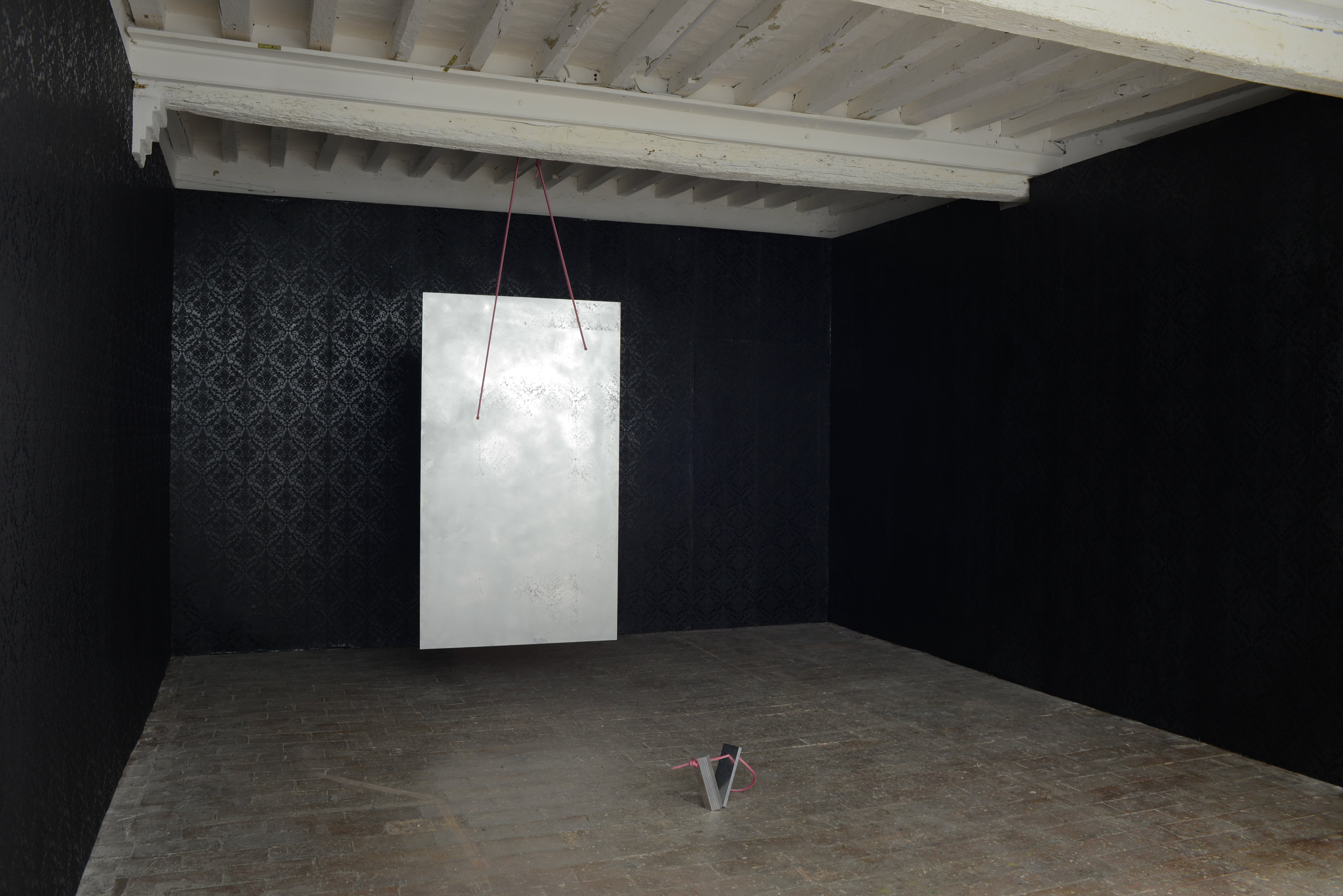 In una stanza quasi completamente rivestita di una scurissima carta da parati barocca, simile a quelle che si possono trovare ancora oggi in alcuni palazzi storici, assistiamo ad un gioco di specchi tra due pannelli pittorici. Il primo funge da elemento riflettente, invece nel secondo l’androide si specchia e sogna il proprio riflesso ritratto come un uomo in armatura ovvero travestito in qualche modo come un cyborg. I tratti del “volto” dell’ipotetica macchina appaiono indefiniti per via dello smalto levigato, tecnica ormai spesso usata dal duo e divenuta loro peculiarità stilistica. Un effetto analogico che inganna per quanto è simile agli effetti glitch digitali.