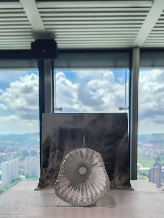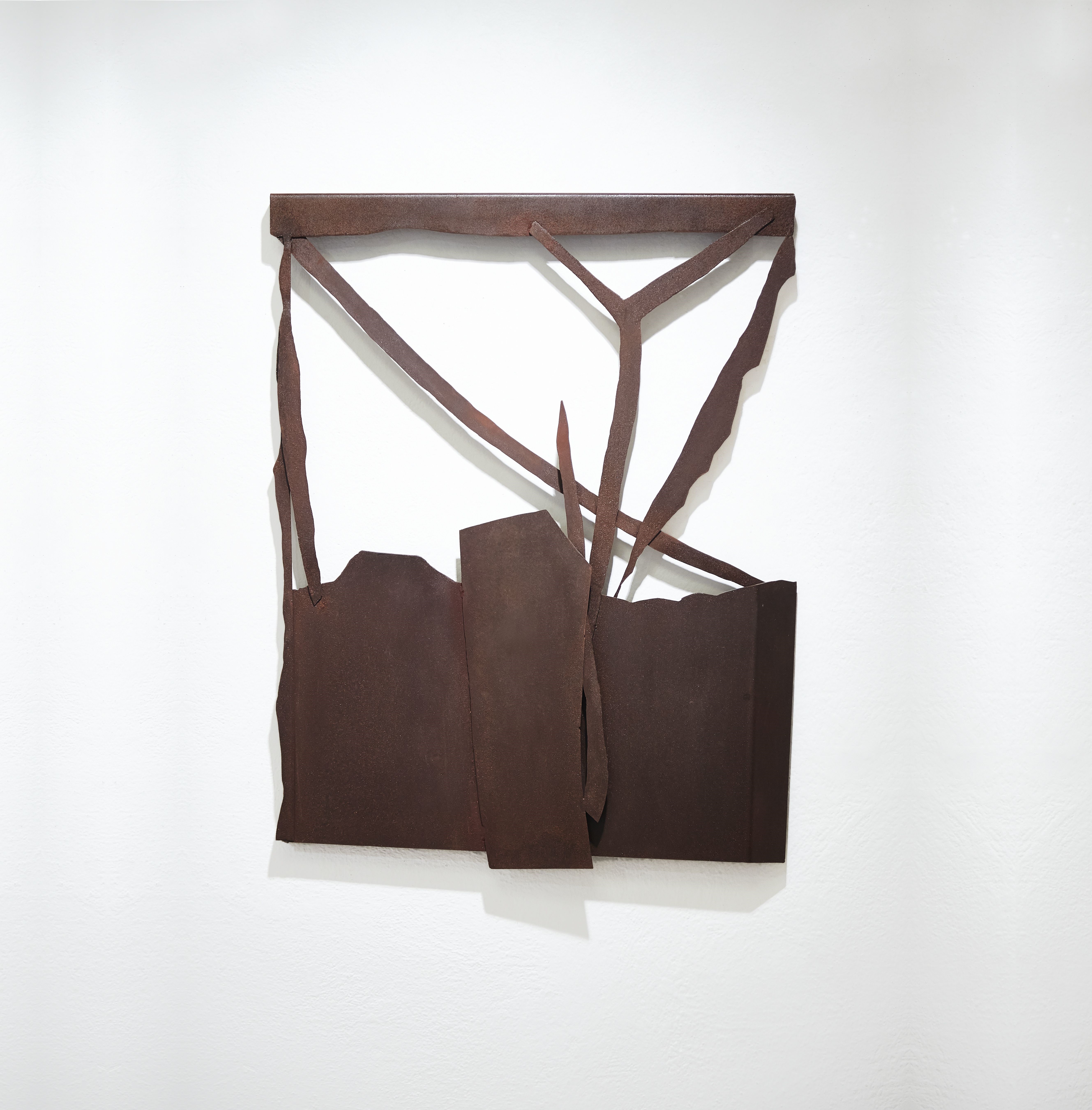 Dalla sagoma di una forma radiante incisa sulla fotografia di una vegetazione arbustiva solarizzata, Sergia Avveduti fa affiorare un’iride cerulea che attira lo sguardo “oltresuperficie”, affine in questo alla seconda opera proposta, Ciglio di sole, sorta di visore in gesso ceramico puntato sul panorama che si estende a perdita d’occhio al di là delle vetrate della Torre. Carta, lamiera e ruggine costruiscono l’astrazione geometrizzante di una Germinazione realizzata da Pinuccia Bernardoni, opera degli anni ‘90 che riecheggia, per l’approccio essenzialmente scultoreo ai materiali, nel disegno antropometrico di una foglia a tratto continuo, impressione del corpo tramite il gesto. Di Mirta Carroli ci sono due aguzze sintesi di querce, fiumi e viole, incantante e irrequiete come l’infanzia e i suoi ricordi. L’acciaio corten a suggerire la dicotomia tra l’idea e la materia che le dà forma.