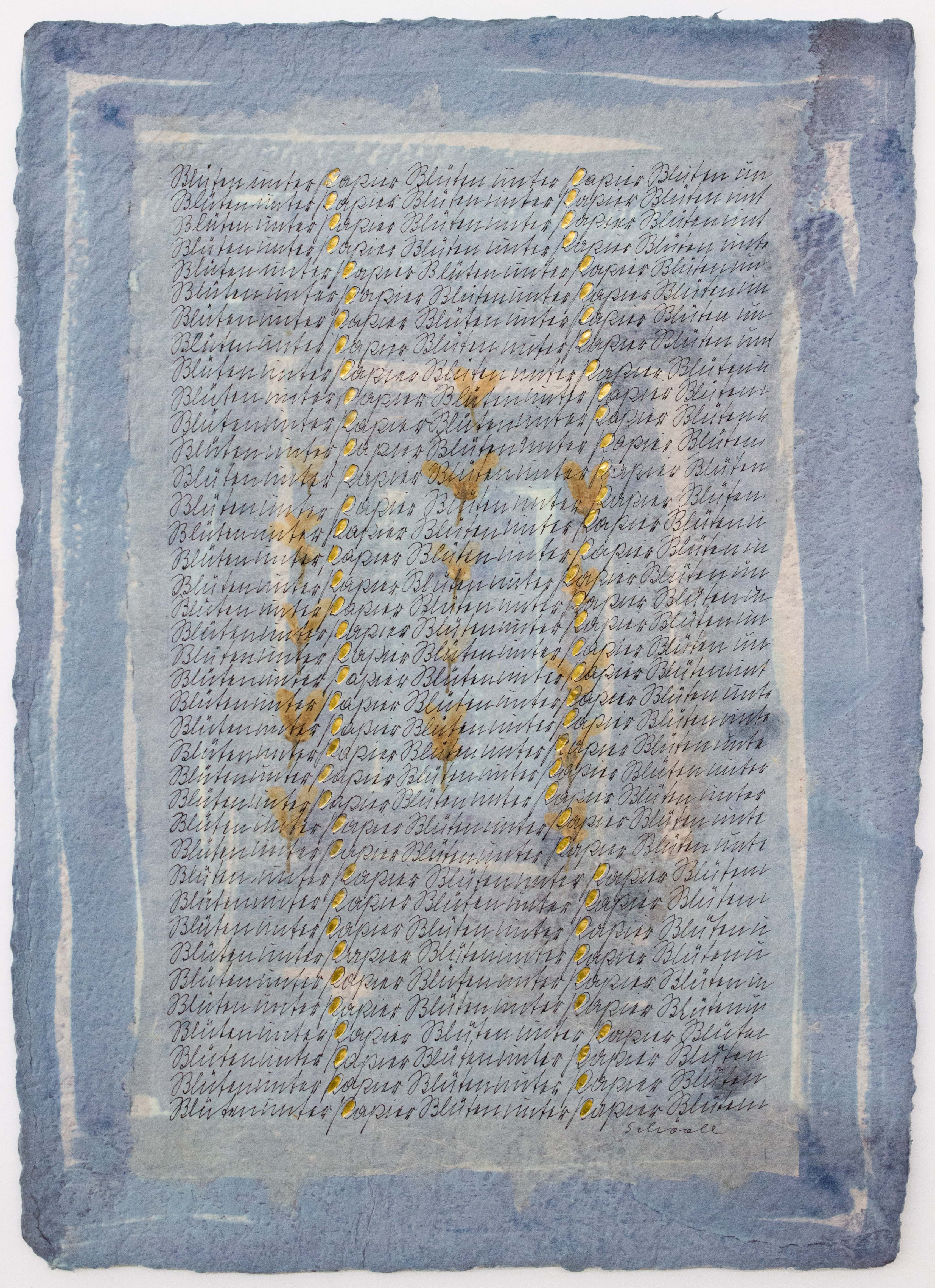 Dalle forme della natura, ispiratrici fidate di Francesca Pasquali, l’artista astrae invece le proprie strutture, le trame, i colori, eleggendo la materia organica e minerale a maestra dell’artificio. Greta Schödl ricava dalla vegetazione i pigmenti per le sue inconfondibili trame di scrittura dove alcune file di lettere, isolate e riempite d’oro, paiono propagarsi sulle superfici di pagine e oggetti come radiazioni elettromagnetiche. Infine la sutura che Sissi esegue tra nature parallele – psicologica, anatomica, botanica: le fibre tessili lavorate come un nido attorno a specchi ciechi, uno dei quali incapsula un disegno di una cortina di rovi che compare all’altezza del volto alla guisa di un autoritratto, estroflettono l’interiore.