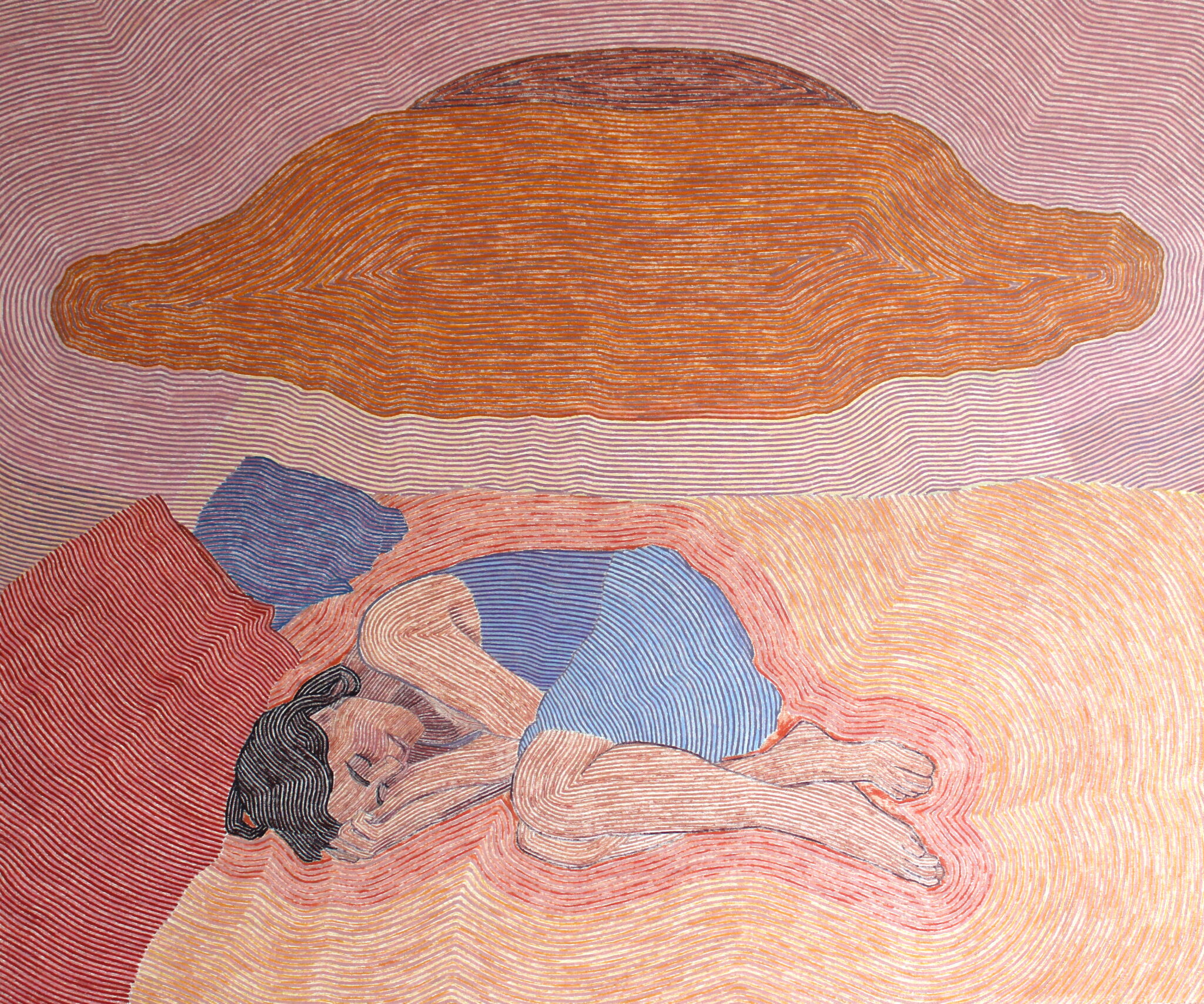 L’immagine del Cristo torna anche in Messenger, estrapolata dalla Resurrezione (1631-32) del fiammingo Anthony van Dyck, dove assume le sembianze di un copro femminile steso su un letto al cui fianco un libro aperto che recita “i’m composed of sound”. Sono frammenti di poesie quelle che si incidono tra le vibranti e vivaci linee parallele e distinte tra loro, con cui Miller traduce pittoricamente il suo immaginario, in tutte le otto tele della serie. Sono frammenti scritti di una collaborazione e di un intimo rapporto affettivo dell’artista con i poeti newyorkesi Courtney Bush, Jameson Fitzpatrick e Marie Howe di cui a volte ne ritrae anche i corpi e i volti all’interno delle composizioni, convergendo esperienze e influenze condivise. Artisti e poeti fungono da tramiti di informazioni e suggestioni di un’altra realtà, dei ricettori sensibili aperti alla ricerca di una comprensione più profonda dell’esistenza.