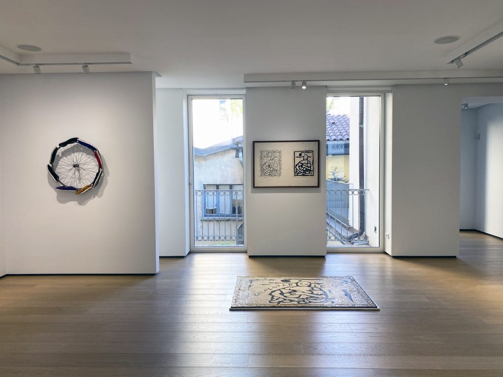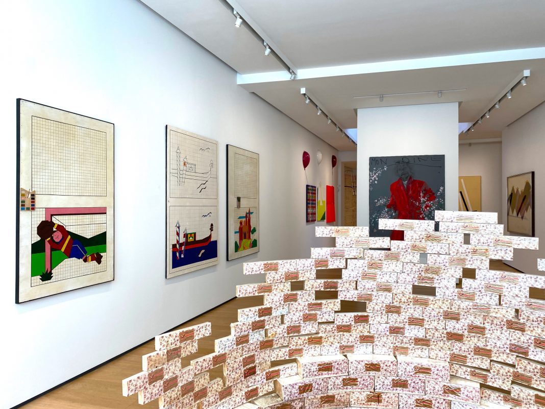 “Aldo Mondino. Regole per l’inganno” prende le mosse dall’emblematica Torre di torrone (1968), realizzata con finti torroni in gesso serigrafati con la nota marca Sebaste. Erano gli anni ’60 e Mondino prese posizioni molto radicali nei confronti dell’Arte Povera, del Minimalismo e dell’Arte Concettuale. L’essenza trasgressiva e la presenza a 360 gradi di Mondino sono ripercorse al piano terra della galleria attraverso alcune delle serie e delle opere più significative. Quadri a quadretti (1963-1964) riprende il concetto classico del dittico ma in un’ottica di azzeramento che implica l’idea performativa del coinvolgimento del pubblico attraverso un margine bianco che invita all’azione. In questa serie ogni regola viene ribaltata e l’azzeramento diventata sinonimo di regressione all’origine, intendendo quest’ultima come atto originale e primigenio. Quanto più, e quanto meglio, allora dell’album da disegno dei bambini? È una provocazione, voluta, per consentire all’opera di recuperare una nuova centralità. Di fronte e poco distante due significativi esempi di Cadute e Bilance, fortemente concettuali, espressive della pittura nella sua componente fisica e interrogative di concetti quali peso, tensione ed equilibrio.