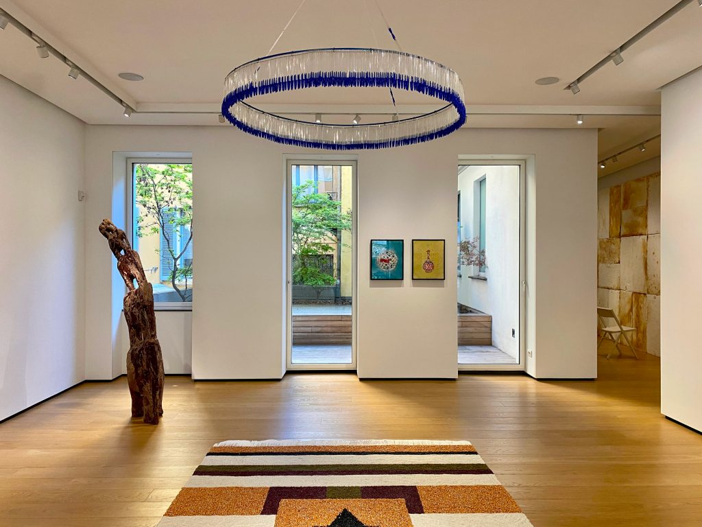 Se il piano terra è dedicato all’esperienza artistica degli anni ’60, il primo piano della galleria ospita una selezione di lavori dedicata a un grande amore di Mondino: l’Oriente. The Byzantine World (1999), realizzata con 12 mila cioccolatini in gesso e legno e ricoperti di carte colorate, è una rielaborazione dell’idea classica del mosaico ma anche una riflessione, profonda, sul concetto di materiale e di durata. Se i i cioccolatini di quest’opera hanno una durata eterna, e una commestibilità nulla, diversa è la filosofia che appartiene a opere effimere come Scultura un corno, ricoperta da cioccolato, Raccolto in Preghiera (1986), un tappeto di dimensioni ambientali e realizzato con riso, mais, soia verde, fagioli rossi e neri e farina, e Muro del Pianto, interamente costruito con zucchero bianco e zucchero di canna, oltre all’inserimento di cespugli d’erba veri. A completare l’esposizione, enfatizzando la ricercatezza dell’immagine secondo il criterio della sovrapposizione di elementi, troviamo alcuni lavori della serie Tappeti stesi (1990-1992) in eraclite e Jugen stilo (1993), il celebre lampadario realizzato con penne bic che strizza l’occhio alla decorazione Jugendstil e gioca, linguisticamente, con il termine ara-bic. Nel corridoio, accanto al Muro del Pianto, le opere 18 KISLEV 5751 (1990) e Metterci una pietra sopra (1999) restituiscono un’intima e personale esperienza dell’ebraismo.