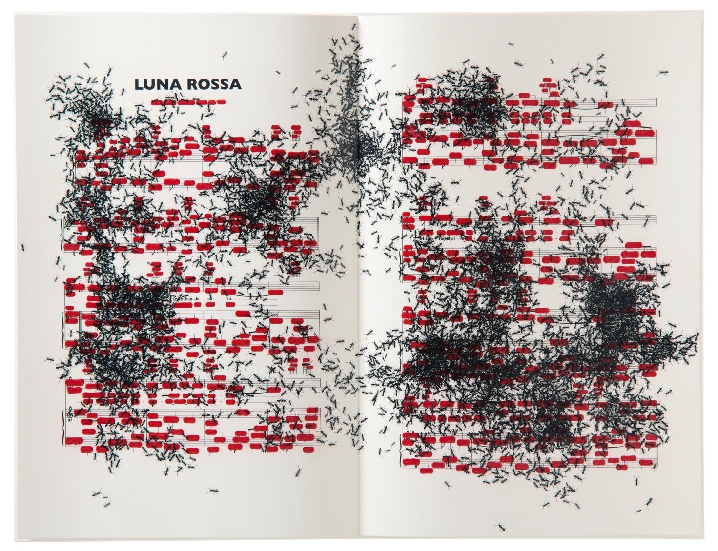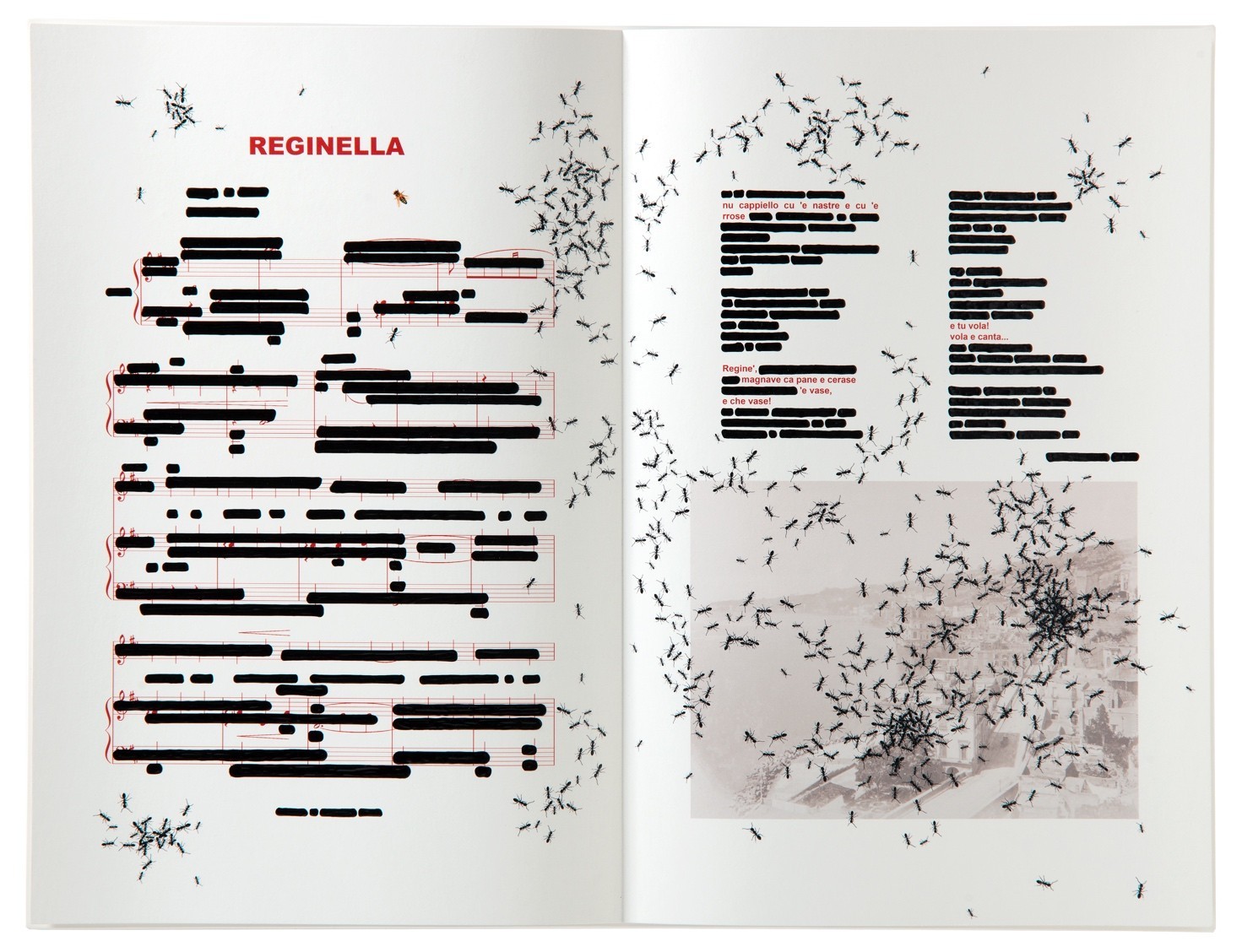 Sulle superfici degli spartiti cancellati intervengono poi figure inattese: api, formiche, insetti che attraversano le partiture come segni mobili, quasi attratti dalla struttura sonora che ancora vibra sotto la cancellazione. «Le api e le formiche musicali di Isgrò sono emanazioni della mente dell’artista – nota Eike Schmidt nel suo saggio curatoriale – segni non pittografici, privi di denotazioni semantiche precise; metasegni senza funzione grammaticale; ipersegni di connotazioni molteplici e reciprocamente contradditorie, come del resto le cancellature stesse. Se però le cancellature evidenziano e celano il testo nello stesso tempo, coprendo le parole per proteggerle e conservarle, le processioni e i grovigli degli insetti introducono sulla superficie della carta, un elemento dinamico. La loro coreografia collettiva rende evidente la dimensione sociale della canzone e, in qualche caso, sembra persino interpretarne il carattere: si pensi ai grandi grumi brulicanti sullo spartito della Tammurriata nera».