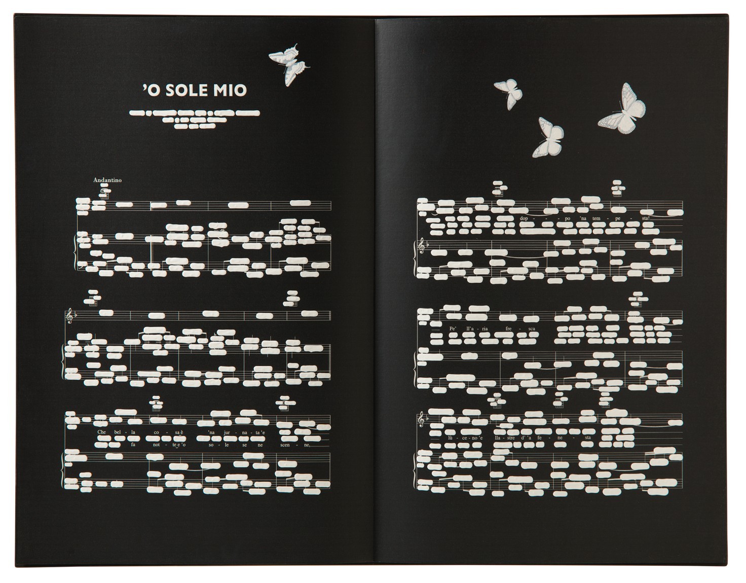 Tra i protagonisti più influenti dell’arte concettuale italiana, Isgrò torna a confrontarsi con il linguaggio e i suoi limiti, applicando per la prima volta la sua iconica pratica della cancellatura al repertorio della tradizione partenopea. 25 partiture, da ’O sole mio a Voce ’e notte, da Reginella a Napul’è, da ’O surdato ’nnammurato a Malafemmena, vengono sottoposte a un processo di sottrazione che, per effetto opposto, rilancia il senso della traccia scritta come forma. Le parole emergono come frammenti, residui, indizi di un discorso che lo spettatore è chiamato a ricostruire.