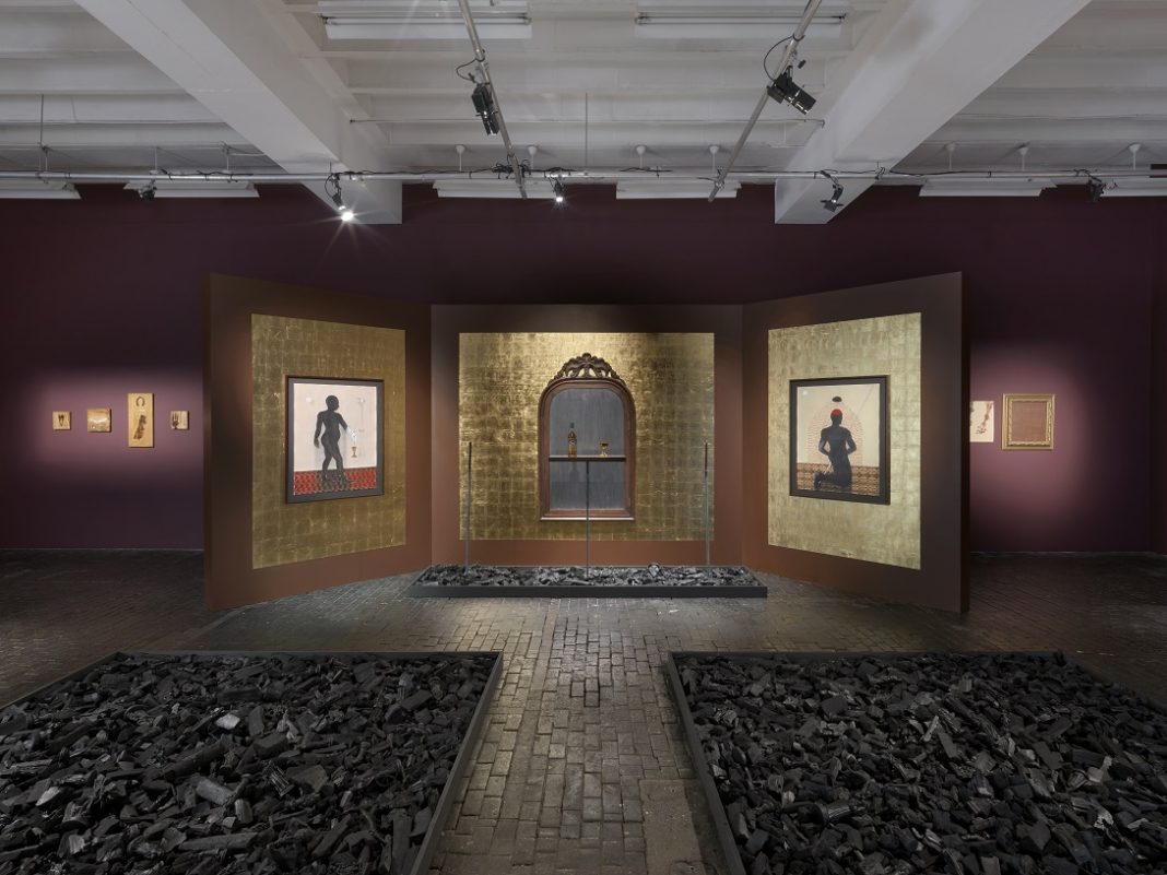 La mostra a Ginevra si apre con un’intensa e lugubre installazione Malungo (2016) Rito para uma missa preta, dove un retablo di medievale memoria, a misura umana, con figure simboliche su fondo oro, è preceduto da un altarolo con un calice e una bottiglia di cachaça a cui si accede attraverso un sentiero lasciato libero da due quadrati a pavimento ripieni di sculturine annerite di santi cattolici e orishas (santi della religione sincretica afrobrasiliana) frammiste a pezzi di carbone di legno. Candele nere e candele bianche completano la complessa e intensa installazione. Già da questa opera è evidente l’universo religioso di riferimento dell’artista, un cattolicesimo carico di emotività e sofferenza tipico dei paesi dell’America Latina e la sua ibridazione con i santi derivanti dall’Africa Occidentale dell’empireo Yoruba che si è espanso dal Benin ed è stato portato con sé dagli schiavi africani. Da una parte la religione dei colonizzatori europei, che però è stata accolta tanto che i santi africani sono accoppiati con i santi del Cattolicesimo, dall’altra la resistenza che si innerva nella storia delle violenze subite, nella memoria intrisa di sangue e sacrificio.