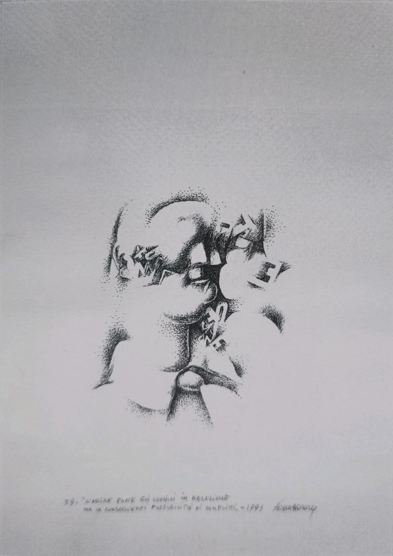 Il gruppo citato risulta prezioso in tale contesto, come testimonianza del grande impiego che l’artista fece del legno, le cui potenzialità apprese nella bottega paterna. Nella sua lunga carriera, il legno rappresentò la possibilità di realizzare delle macchine non funzionanti, risposta all’Italia sempre più industrializzata. In questo caso, le macchine sono in realtà due figure umane intente in un dialogo. Nel 2015 Figure dialoganti entra a far parte della collezione universitaria V.Ar.Co. – Vanvitelli per l’Arte contemporanea, collezione nata nel 2010 a opera della professoressa Gaia Salvatori e l’affiancamento di Luca Palermo. Alla stessa Gaia Salvatori e Nadia Barrella si deve anche il progetto allestitivo della mostra, che divide le opere per tematica e raccoglie opere eterogenee che spaziano dal disegno, al collage, tecnica mista e scultura. In definitiva, memorie dialoganti è una mostra piccola, intima ma non per questo meno incisiva.