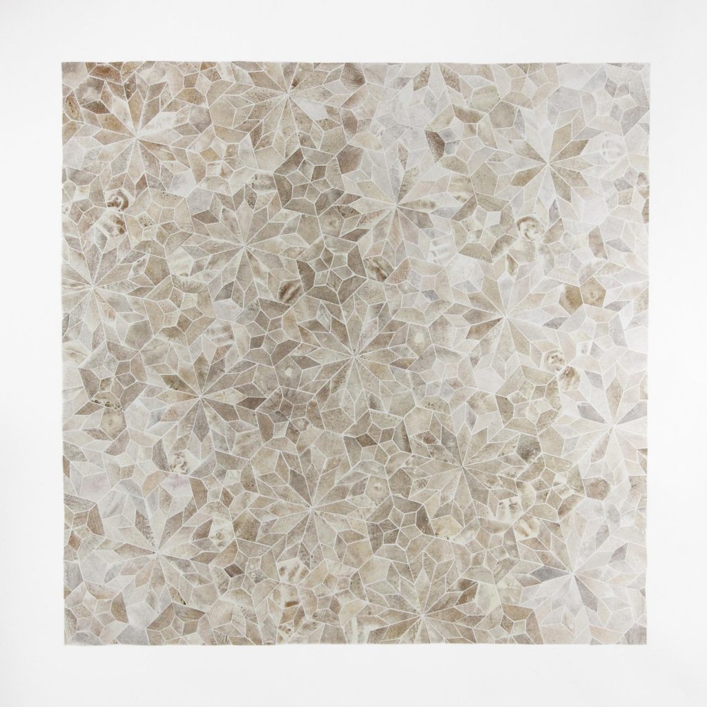 Sulle pareti sono esposti due lavori, i più grandi mai realizzati, della serie Aniconico: sono mosaici in pietra o impronte del corpo dell’artista? L’allestimento restituisce la sensazione, e la visione di un corpo unico. Anche se la fisionomia umana, in questo ciclo, non è mai riconoscibile nella sua soggettività: riusciamo a scorgere nell’opera frammenti di una figura umana, ma non comprendiamo chi sia, nelle opere di Cavea marini Piovesan cattura in e attraverso essi la propria figura intera. Gli apparenti mosaici di corpo derivano dalla mappatura del corpo realizzata attraverso il contatto tra la pelle e il nastro adesivo. Il corpo di ri-composizioni geometriche è universale e non riconoscibile per richiamare e tendere un nuovo ordine trascendente.