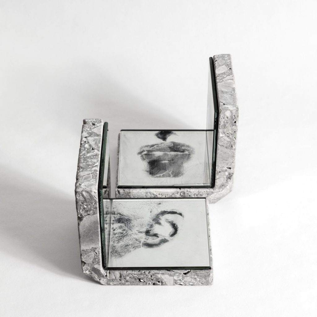 Nello spazio di Cavea Marini Piovesan presenta, sull’installazione Blocco, un cubo-lavabo disegnato dall’architetto Rava, Piovesan presenta alcune opere scultoree della serie Eco, realizzate per l’occasione con la pietra Ceppo di Grè spazzolata. L’artista ha scelto di impiegare questa pietra perché costituisce lo strato esterno della montagna, che custodisce, come lo fa la nostra pelle, un contenuto prezioso: il Ceppo è così inteso come la pelle della montagna, quel sottile strato che unisce il mondo esterno alle viscere della Terra, al Nuvolato di Grè. Non a caso la finitura scelta è stata la pietra spazzolata, che rende il ceppo poroso, come se fosse segnato da rughe e pieghe epidermiche. Questo ciclo di opere nasce dalla serie Specchianti, con cui Piovesan ha catturato le impronte del proprio corpo su vetri che venivano poi specchiati. L’attenzione, a Cavea Marini, è indirizzata alla pelle come strumento di difesa dal mondo esterno. Il titolo, Eco, si ispira al mito della Ninfa Eco che si consumò per l’amore non corrisposto nei confronti del bellissimo Narciso. Tale fu il dolore che di lei rimasero solamente la voce e le ossa pietrificate. Gli specchi, impressi del corpo di Francesca, sono posti all’interno della corazza realizzata in ceppo di Grè, dando forma a un’eco infinita di caleidoscopici riflessi.