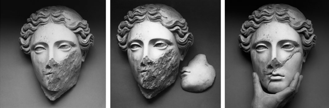 Il cielo è quasi tutto azzurro è la mostra che riunisce le fotografie di Mimmo Jodice (Napoli, 1934), in collaborazione con la Galleria Vistamare diretta da Benedetta Spalletti. Cinque scatti che colgono a pieno la poetica struggente del fotografo partenopeo, in particolare nella sua ricerca dedicata all’archeologia e al Mediterraneo. In particolare, nel Trittico di Demetra, dell’inizio degli anni Novanta, il volto della statua antica viene fotografato in tre momenti diversi in cui si tenta di ricomporre il frammento caduto. Una narrazione che, in pochi scatti, riesce a evocare «un passato che irrompe nel presente», il mistero della bellezza classica che Jodice celebra attraverso il suo bianco e nero intenso, la mano del contemporaneo che accarezza il reperto antico. «In questo mio Mediterraneo io ritrovo l’eternità dei luoghi, immagini di architetture, paesaggi pieni di bagliori, cavità misteriose, frammenti di corpi e volti che hanno visto e ci parlano di vicende lontane», afferma. «Un omaggio al grande maestro napoletano che ha da poco compiuto novant’anni e che con il suo sguardo ci insegna a guardare con occhi nuovi anche ciò che crediamo di conoscere», aggiunge Benedetta Spalletti. Il legame con una classicità atemporale – filo rosso perseguito da Palazzo Velabro, gioiello settecentesco nei pressi dei Fori Imperiali – trova eco anche nelle altre opere disposte tra la reception e il corridoio che porta alle camere. Tra queste, l’opera di Joseph Kosuth Maxima Proposito (Ovidio) del 2017, un dittico che presenta le scritte al neon Venus ventus temerarus / Venus favors the bold e Dum loquor, hora fugit / While I speak, the time flies, parole tratte dai testi di Ovidio; seguono Dittico, Azzurro, Toro di Ettore Spalletti (2014) le cui ricerche luministiche si riverberano sulla superficie opaca celeste, cifra inconfondibile dell’autore abruzzese. Ancora, il dialogo con Roma è sottolineato dal soffitto dell’ingresso di Palazzo Velabro, affrescato dal giovane artista Edoardo Piermattei che si ispira ai colori della città e in particolare ai suoi elementi fondativi, l’acqua e il tempo, per realizzare un paesaggio astratto proveniente dall’osservazione circostante.