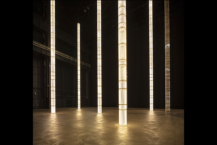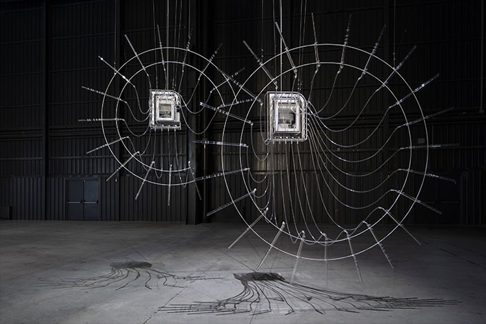 La mostra si apre con sette colonne luminose (StarStarStar/Steer (totransversephoton), 2019) dalle fattezze classicheggianti ma dalla struttura contraddittoria. I LED di cui sono composte si azionano seguendo una partitura muta, le cui variazioni si percepiscono grazie al mutare della luminescenza, che passa da fioca a brillante. La loro monumentalità è apparente e resa vana dalla mancanza di una funzione strutturale e dall’evidente sospensione, e la loro stessa presenza è quasi messa in discussione dal loro spegnersi e rivelare la struttura composta di vetro, cavi elettrici e parti metalliche.