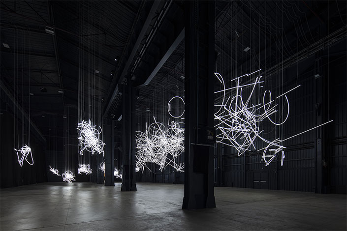 La distribuzione delle installazioni a neon nelle due Navate corre parallelamente e segue una sincronia prestabilita, come a formare una composizione unitaria; non c’è un percorso di fruizione predisposto, l’ambiente invita il visitatore dapprima ad abbracciare lo spazio con un colpo d’occhio, poi ad addentrarsi per distinguere le varie opere. Entrambi i corridoi iniziano con due riferimenti alla visione presi in prestito da Marcel Duchamp. Radiant Fold (…the Illuminating Gas) (2017-2018) è una citazione dei “Témoins oculistes” (Testimoni oculisti), disegni che richiamano strumenti ottici che l’artista francese inserisce in La Mariée mise à nu par ses célibataires, même, detto anche Il Grande Vetro. Anche il nome dell’opera – e della mostra – sottolinea il debito che Wyn Evans ha nei confronti del maestro del Novecento, in quanto “le gaz d’éclairage” (il gas d’illuminazione) è parte del titolo che Duchamp assegna al diorama creato tra il 1946 e il 1966 che riflette sul ruolo voyeuristico dell’osservatore. A seguire, lungo le Navate le composizioni di neon cambiano registro, da un lato si presentano come installazioni disseminate nello spazio, dall’altro si impone un’opera monumentale più compatta; rispettivamente Neon Forms (after Noh) (2015-2019) e Forms in Space… by Light (in Time) (2017) rappresentano il corpo principale e il fulcro della mostra. All’apparenza sono forme spontanee, astratte o addirittura confuse, in realtà restituiscono sotto forma di luce una secolare tradizione giapponese. Il Noh, nato nel XIV secolo e tuttora diffuso, è una pratica teatrale in cui prevale la gestualità degli attori rispetto alla narrazione. I movimenti lenti, l’uso di maschere, la trascurabilità dei dialoghi, rendono le rappresentazioni teatrali simili a dei rituali. Questa ritualità è codificata nei “diagrammi dei kata” che l’artista traduce in luce, i gesti così non solo vengono evocati, ma risultano tradotti in energia. Nel prediligere questa forma teatrale Cerith Wyn Evans sembra rimanere ancorato al cinema strutturale che l’ha influenzato, la cui poetica vede la forma prevalere sulla sceneggiatura. Nell’uso dei neon sembra condensare l’idea duchampiana secondo la quale l’uomo può essere rappresentato come una macchina e quindi apre alla possibilità che un medium frutto di alta artificialità possa raffigurarne i movimenti. Questa operazione non è solo una traslitterazione ma un vero atto creativo, nelle installazioni si possono individuare delle forme che si modificano secondo l’alternanza di stasi e movimento, e quindi implicando lo svolgimento di un’azione viene introdotto il tempo. Forms in Space… by Light (in Time), la più grande installazione la cui luce pervade lo spazio, riassume e amplifica la poetica dell’artista. Nel titolo racchiude gli elementi chiave, forma, spazio, luce e tempo, ed estendendosi per quasi tutta la lunghezza della navata costituisce, proponendo una metafora musicale, il tema principale su cui concettualmente si avvicenda cadenzata la serie Neon Forms.