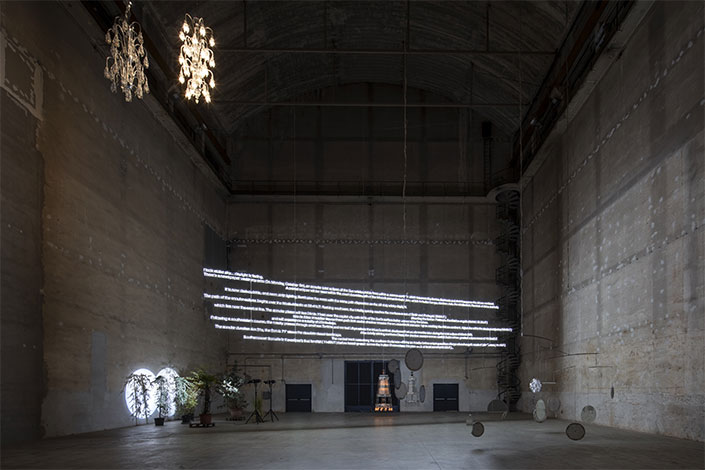 Cerith Wyn Evans (Llanelli, Galles, Regno Unito, 1958) conduce gli studi e inizia la sua carriera come videomaker. Solo dagli anni novanta inizia a mutuare il linguaggio filmico in altri medium artistici, senza tuttavia abbandonare i concetti registici e di montaggio maturati. Dal cinema strutturale inglese degli anni ‘80 conserva la predilezione per l’antinarrativa. Inoltrandosi tra le campate di Pirelli HangarBicocca si capisce come i pilastri su cui si basa il cinema – luce, suono e tempo – permangano nell’evoluzione artistica di Wyn Evans esposta in quella che è la sua più grande mostra personale concepita fino ad oggi. L’Hangar accoglie perlopiù installazioni recenti e alcune prodotte o riadattate per lo spazio in modo da creare un dialogo proporzionato in un’ambientazione su misura. Il background sperimentale dell’artista non è evidente, ma lo si deduce dall’estrema sintesi che compie e che si materializza in luce simbolica, rappresentativa e grafica. La configurazione dell’esposizione verte su scale e ritmi che oltre alla luce coinvolgono il suono, e sovvertono alcune percezioni consuete dell’osservatore.
