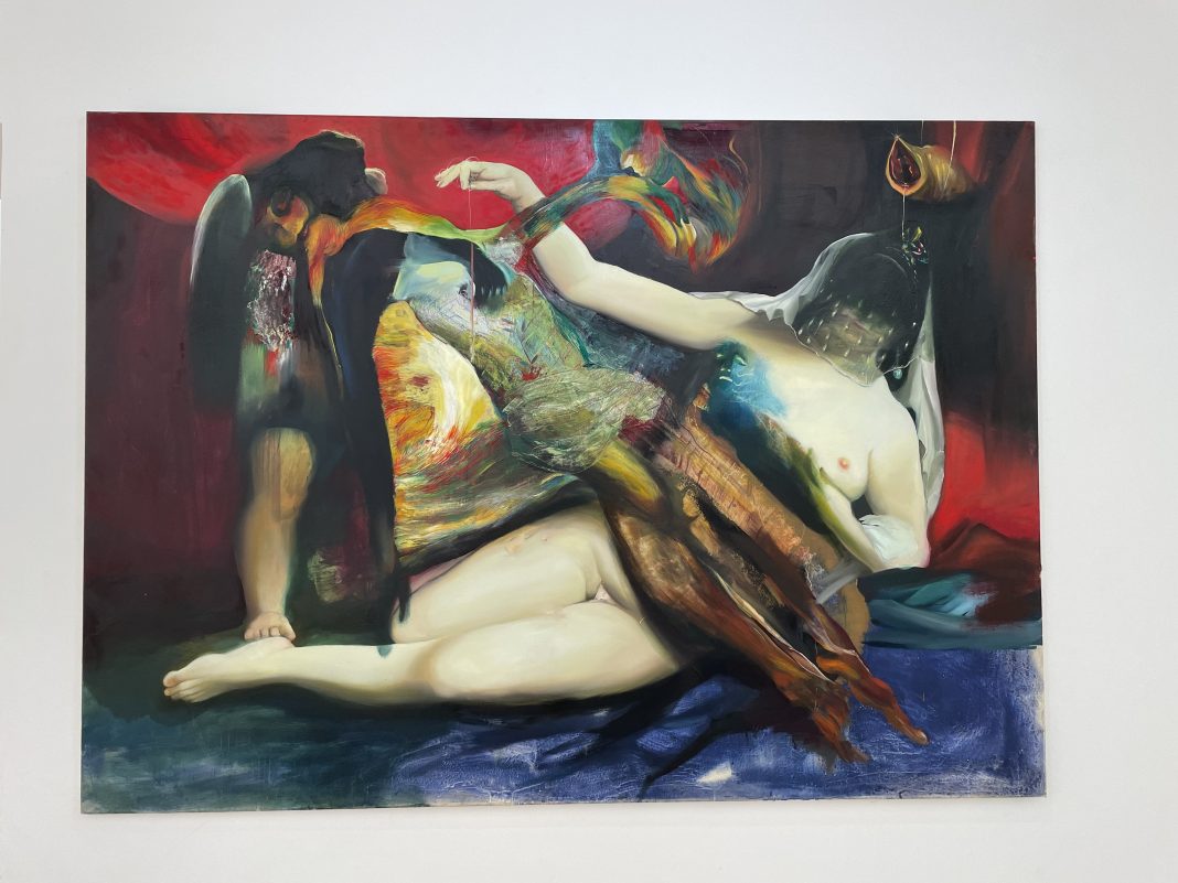 Chiara Calore attinge a piene mani dalle opere d’arte medievali, fiamminghe e barocche, abilmente combinate con tecniche contemporanee, creando un corto circuito estraniante per lo spettatore dove la pittura densa si alterna a punti liquidi e gli elementi simbolici trovano spazio nella tela. Nelle Veneri la femminilità non teme di mostrarsi, ma è con Danae che si lascia andare ai piaceri carnali sotto una luce divina e alla presenza dei levrieri, fedeli guardiani. Accompagnano queste tele appassionate “Dolci sogni”, un cavallo dormiente a rappresentare l’impulso domato; Senza titolo (2021) dove in un paesaggio oscuro e indefinito spiccano degli uccelli dai colori brillanti, la purezza ritrovata e la rinascita; e due ritratti: Overmask che mentre guarda allo spettatore medita sulla morte e sulla vita eterna e il medievaleggiante Senza titolo (2022) dove si ritrova ancora una volta la simbologia della rigenerazione.