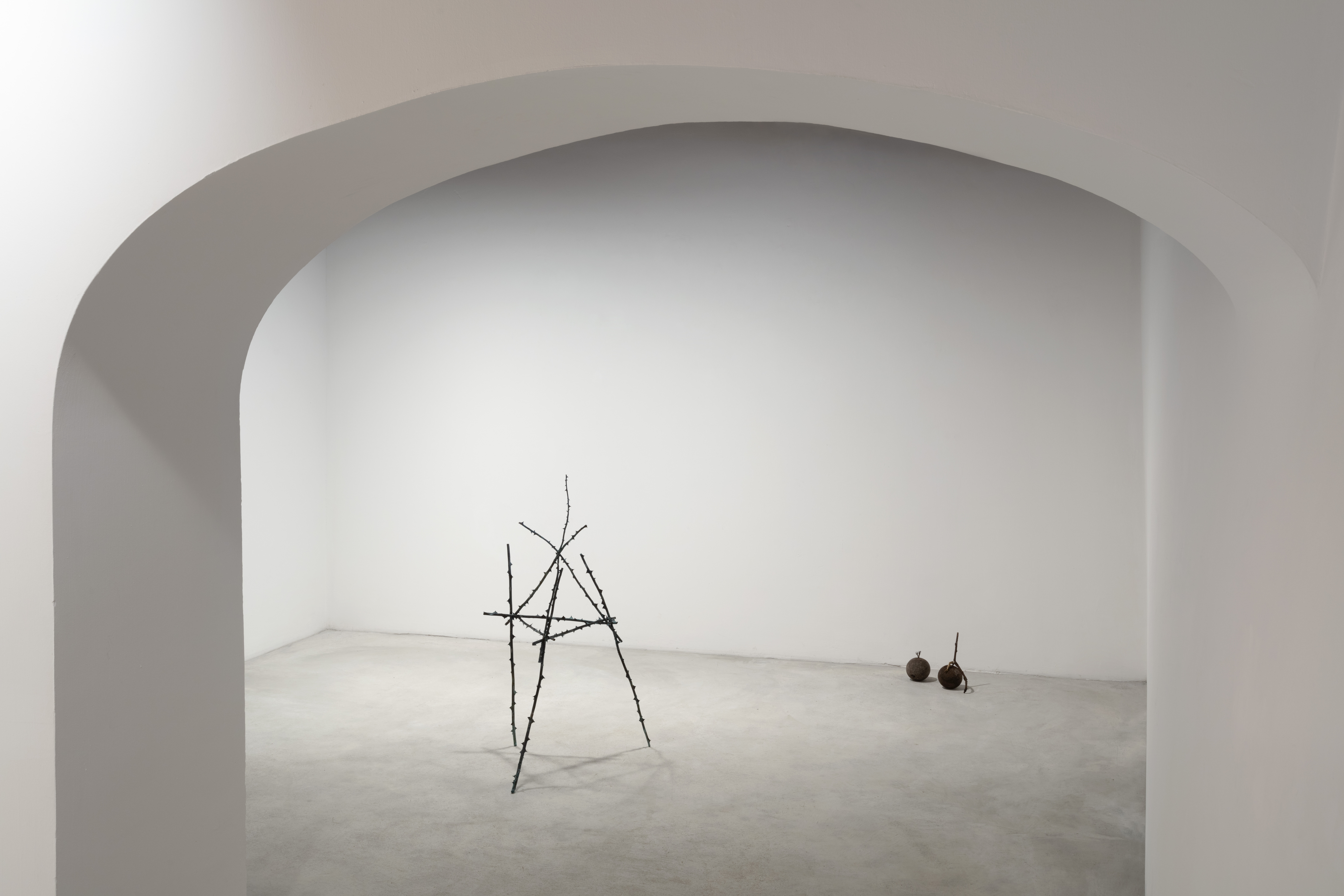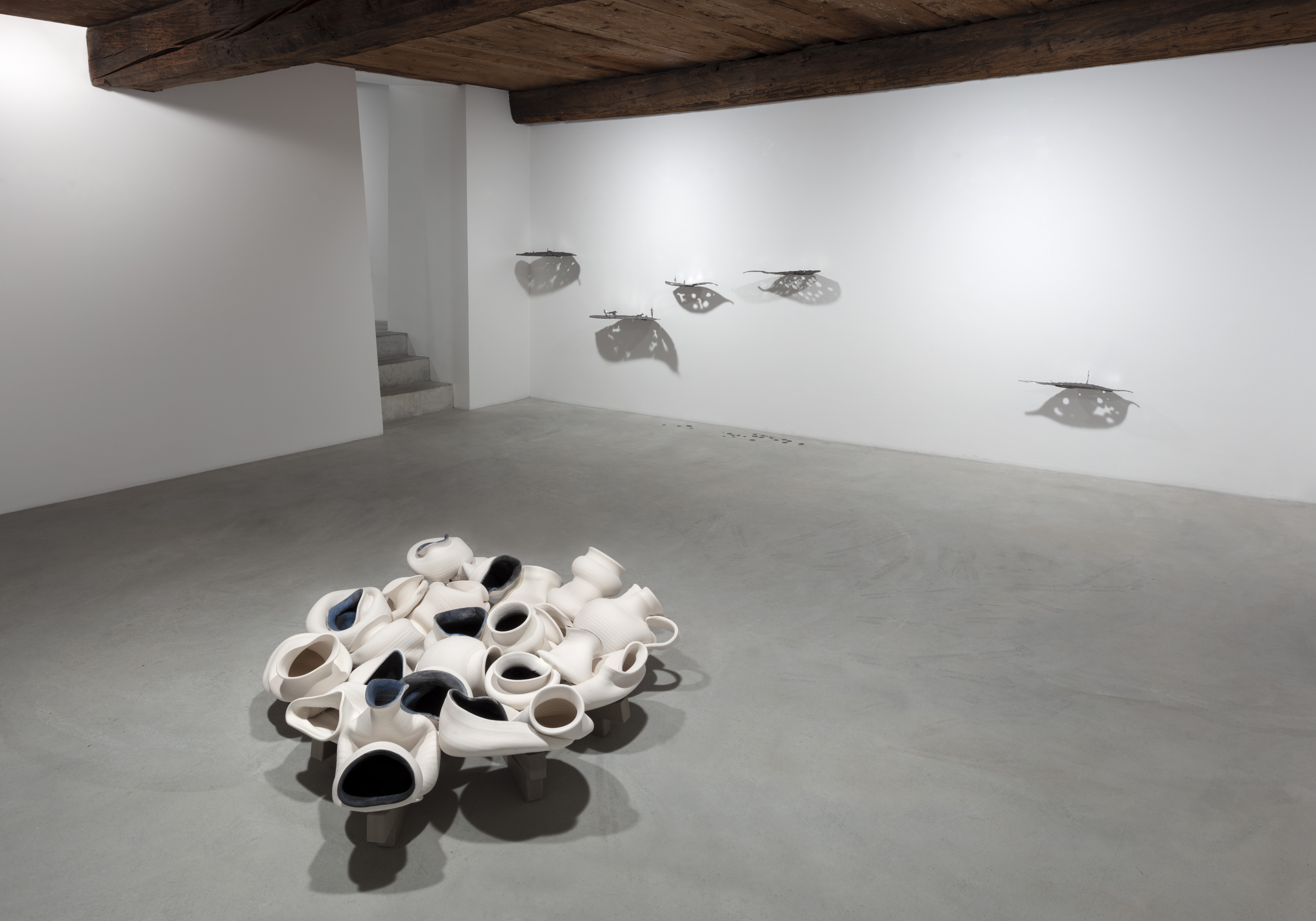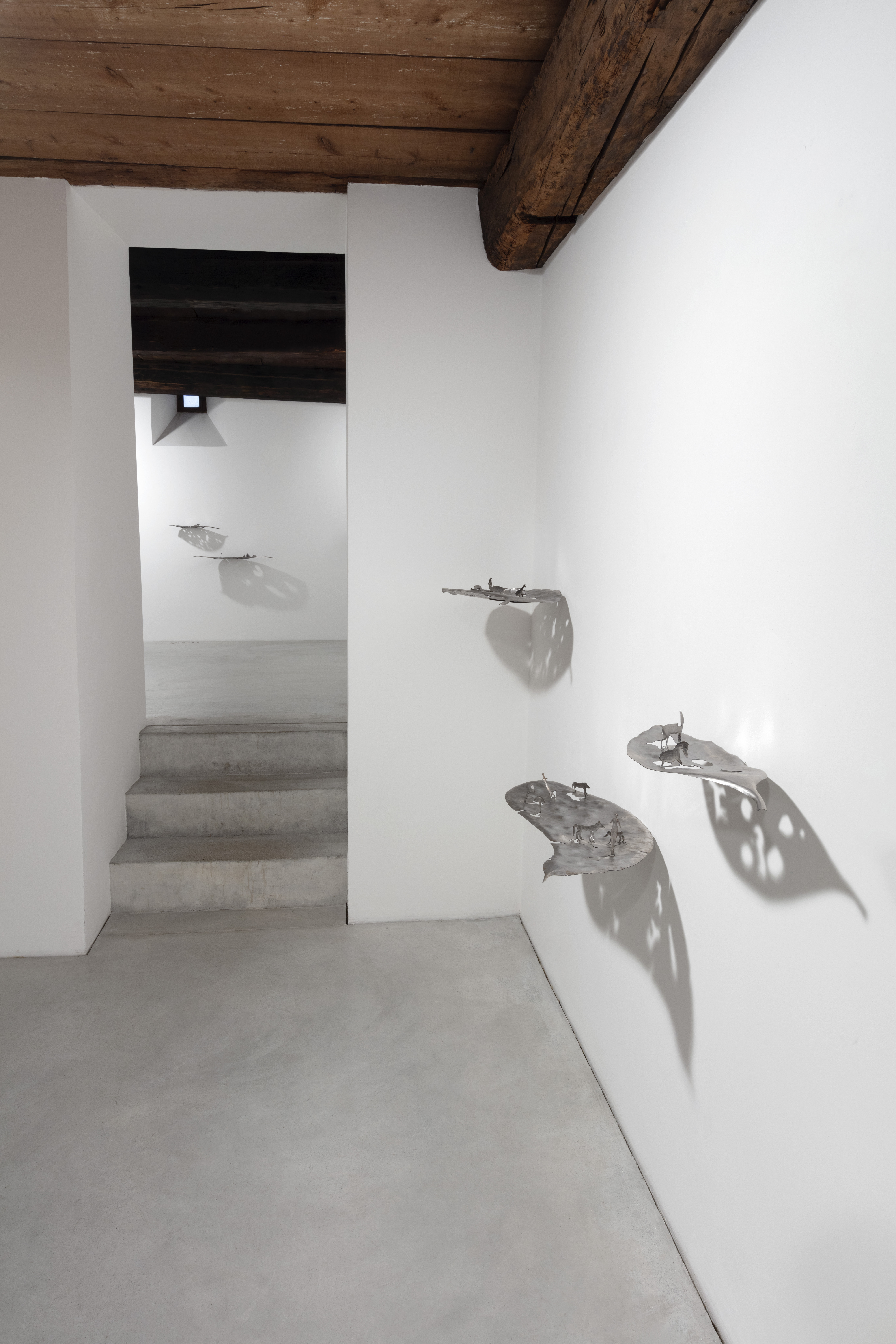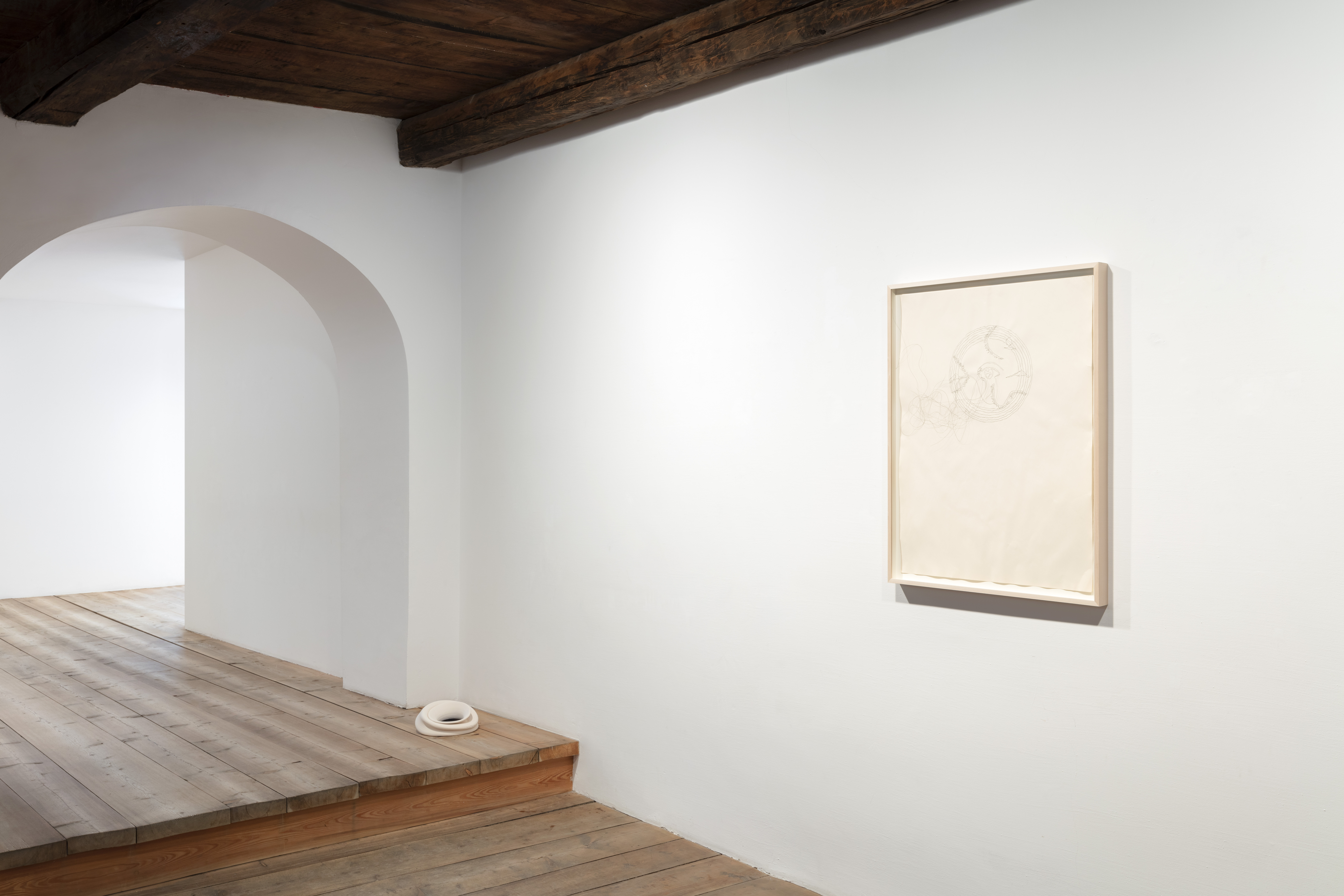 «Lo spazio della galleria di Zuoz della Galleria Monica De Cardenas è un’antica casa contadina che ha subito diversi rimaneggiamenti, i più importanti dopo incendi distruttivi. L’ultima sistemazione ha tenuto conto della sua articolata stratificazione storica e spaziale. Altezze diverse, scale, stanze: un corpo complesso. Avevo in testa l’addentrarsi in un bosco per l’allestimento. Lo sguardo passa da un dettaglio all’altro, da un’opera all’altra, creando relazioni di cui il fruitore diventava il teatro/scena itinerante e che ricompone in base alla propria esperienza. Una forma ricorrente nella mostra è il cerchio, come sfera, occhio, vortice, foro, coppella. L’altra è lamano che accoglie, raccoglie, trattiene e nasconde».