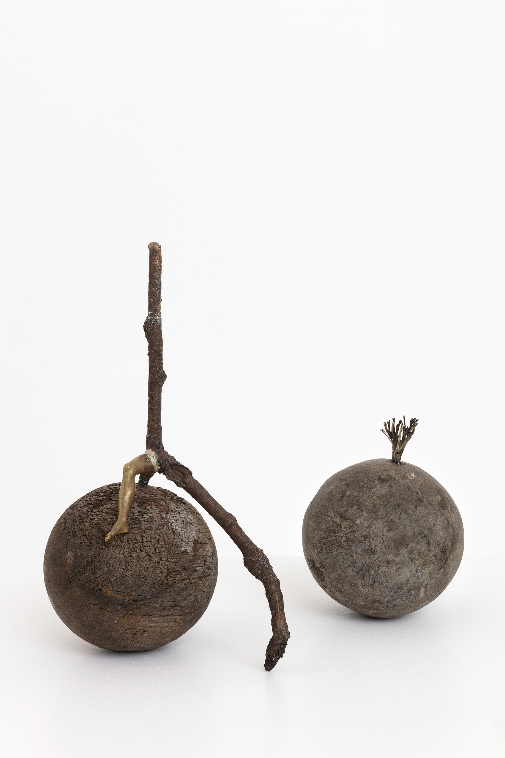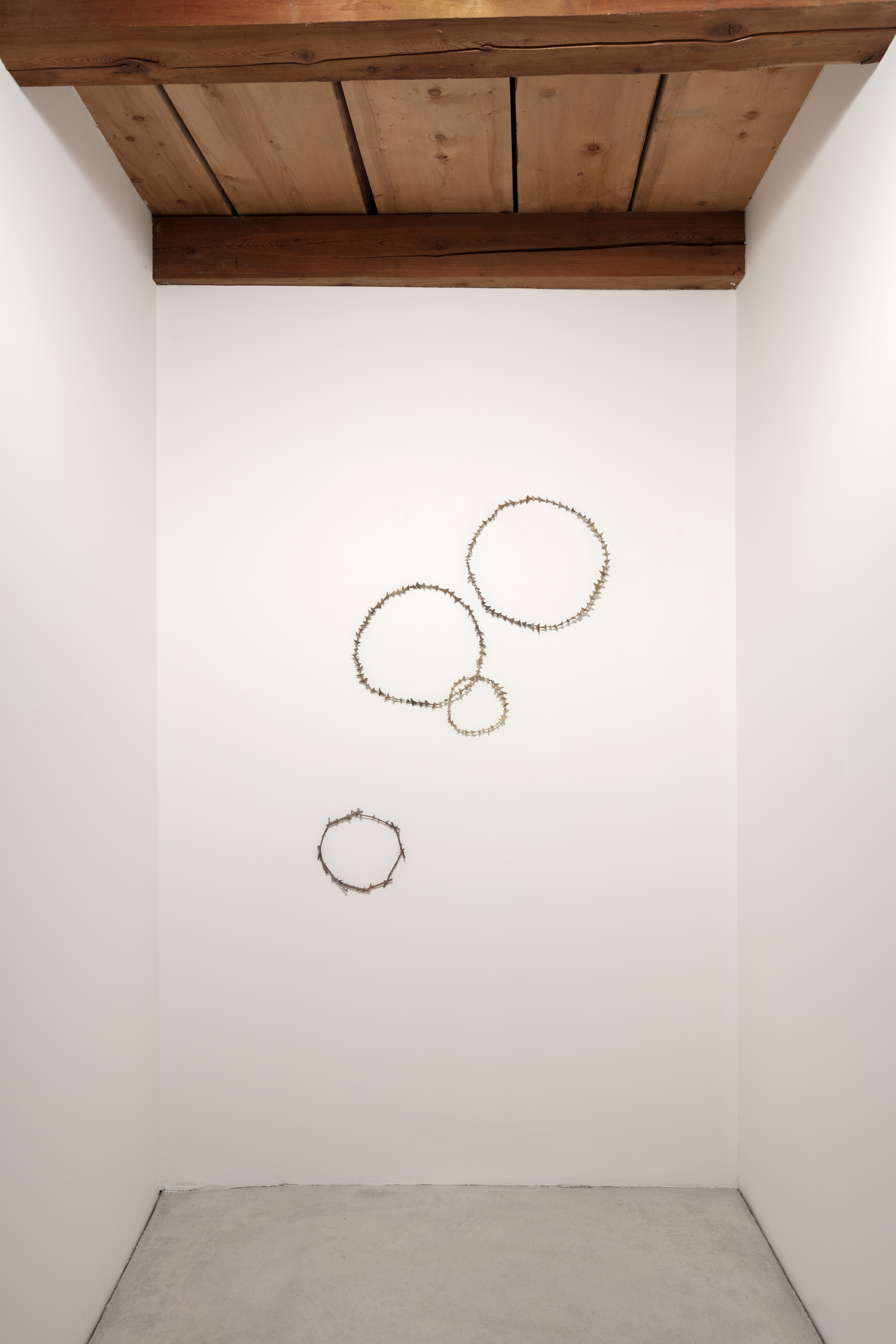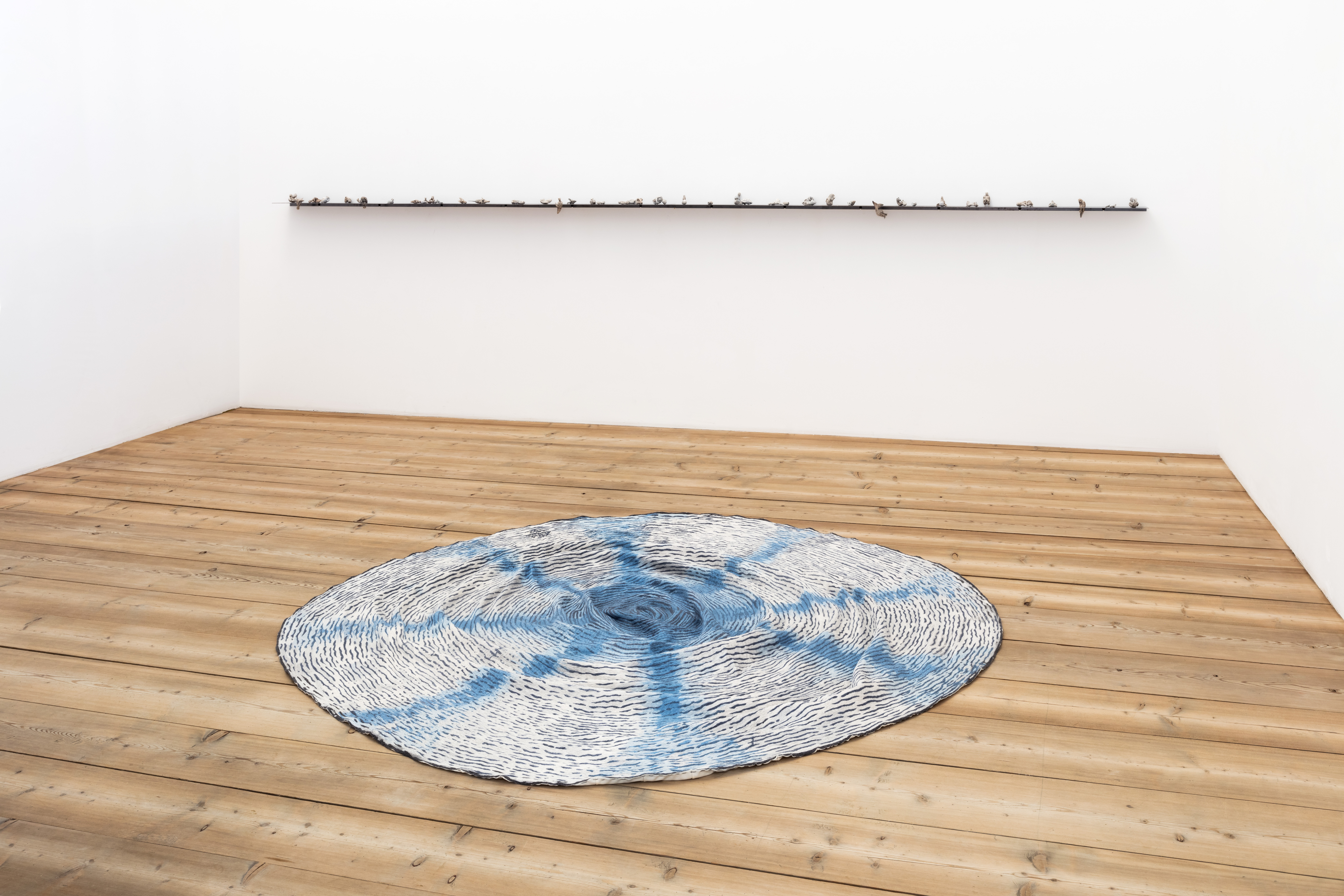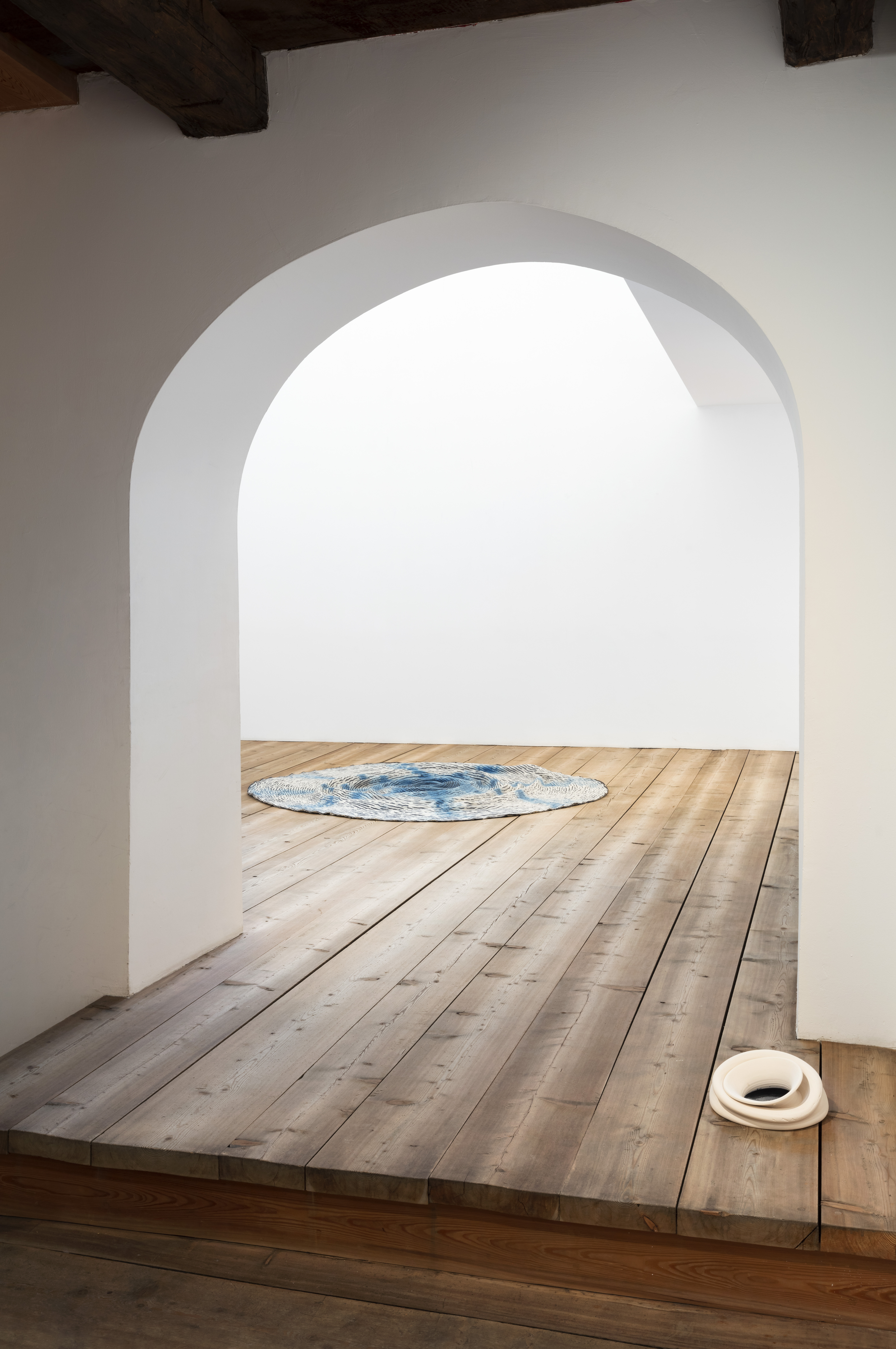 «Lo spazio della galleria di Zuoz della Galleria Monica De Cardenas è un’antica casa contadina che ha subito diversi rimaneggiamenti, i più importanti dopo incendi distruttivi. L’ultima sistemazione ha tenuto conto della sua articolata stratificazione storica e spaziale. Altezze diverse, scale, stanze: un corpo complesso. Avevo in testa l’addentrarsi in un bosco per l’allestimento. Lo sguardo passa da un dettaglio all’altro, da un’opera all’altra, creando relazioni di cui il fruitore diventava il teatro/scena itinerante e che ricompone in base alla propria esperienza. Una forma ricorrente nella mostra è il cerchio, come sfera, occhio, vortice, foro, coppella. L’altra è lamano che accoglie, raccoglie, trattiene e nasconde».