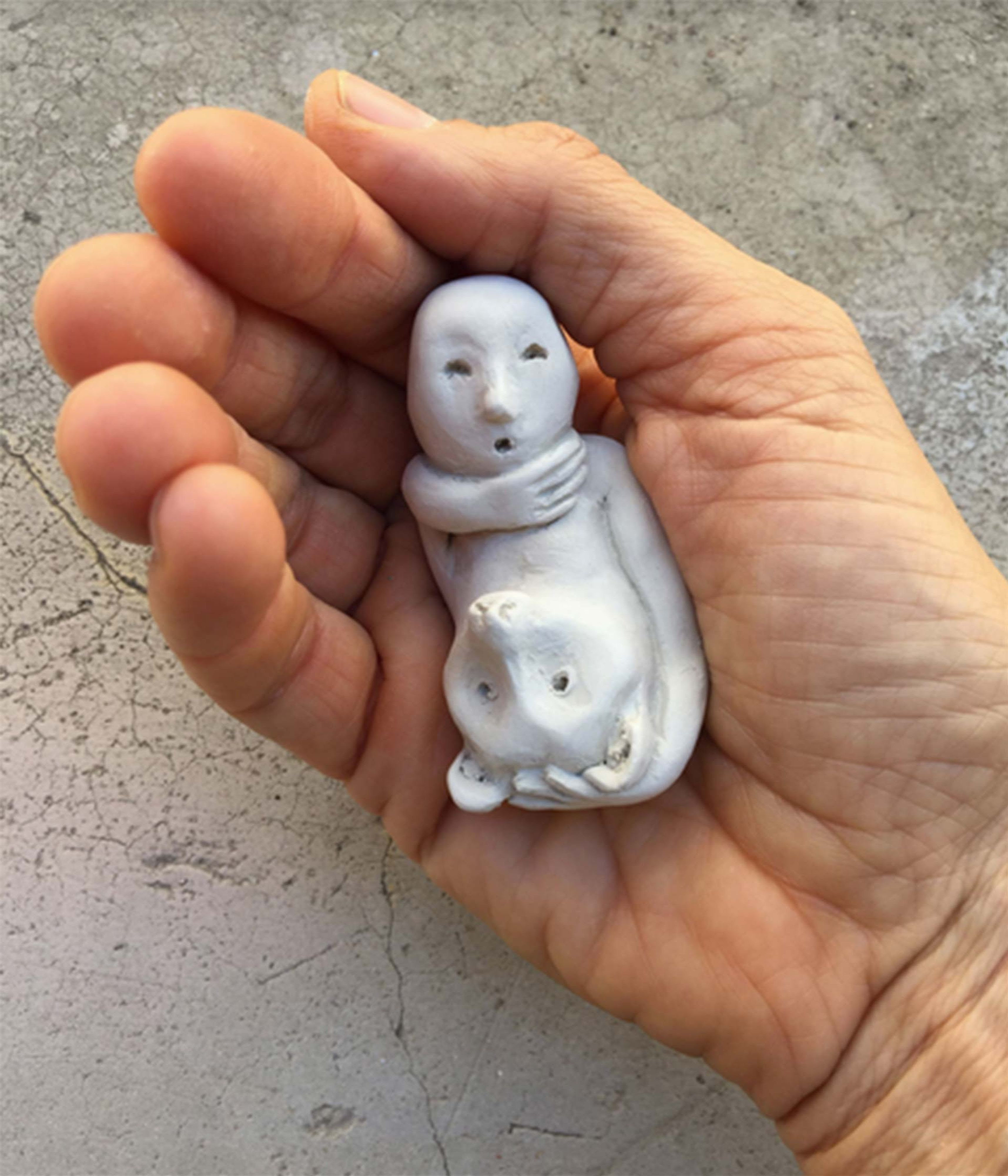 In particolare lo vedo per l’opera più recente, nata come risposta “naturale” allo smarrimento durante la scorsa primavera. Ho modellato una cinquantina di Amuleti in terraglia bianca (nel video qui sotto), cotti e tinti all’apertura dei confini (grazie ad Aida Bertozzi). Quasi ogni giorno nasceva una combinazione tra un animale e una figura umana nell’atto di urlare. Nei primi pezzi realizzati, la bocca era spalancata per farsi man mano più silenziosa fino a scomparire. Mi sarebbe piaciuto metterli in viaggio di tasca in tasca, queste forme “d’energia buona”, come li nomina Dacci. Il pensiero corre alla scatola di fiammiferi in cui Alberto Giacometti raccolse, durante la guerra, privo del suo studio, alcune sue sculture, un “umanità infiammabile” come un piccolo museo da portare in tasca.