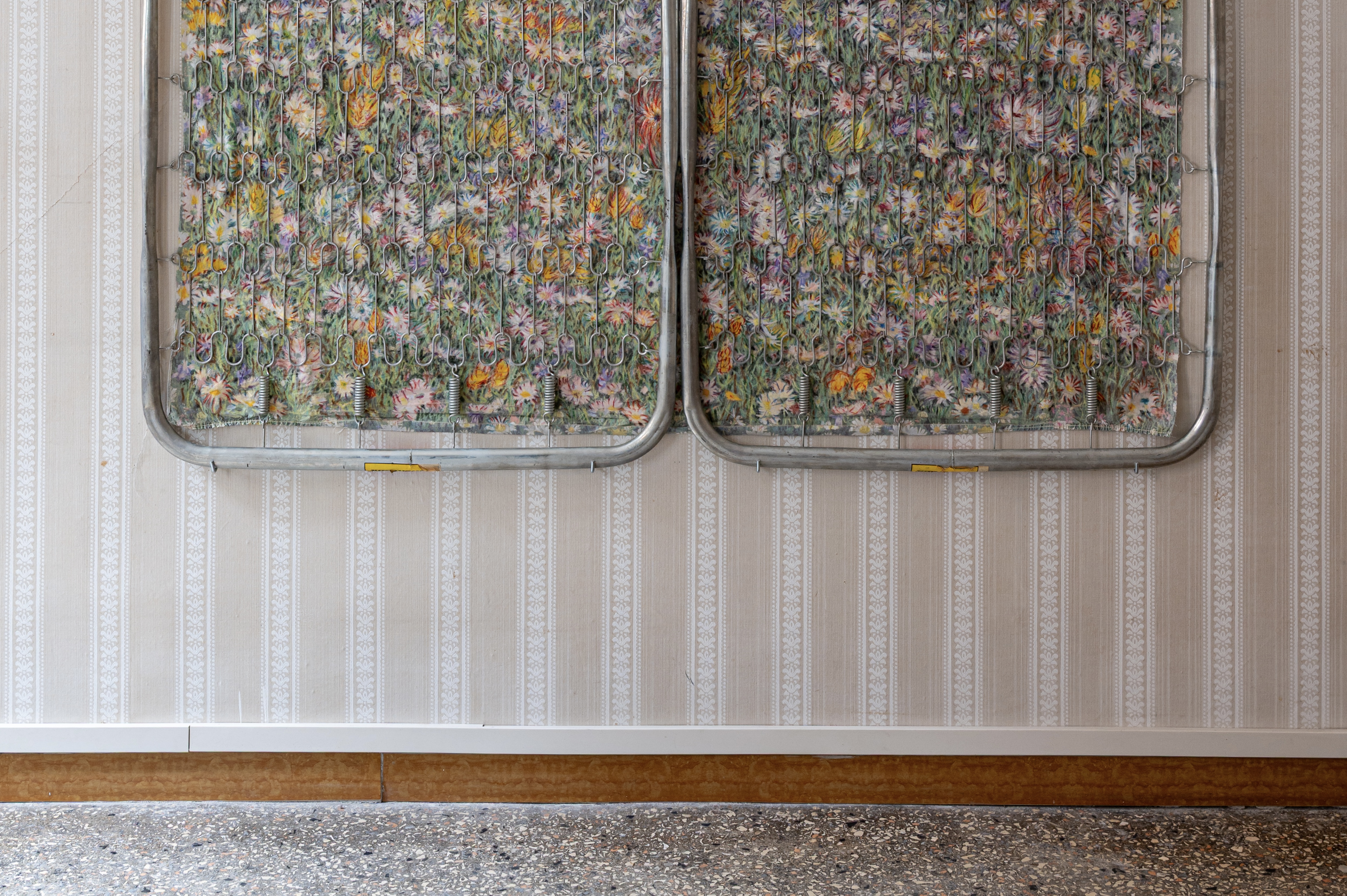 A chiudere il corridoio è la camera da letto matrimoniale, ripensata da Kyle Meyer come luogo intimo e identitario messo in discussione. Fotografie e tessuti, materiali legati al corpo umano, si intrecciano creando un’atmosfera sospesa, quasi metafisica. La porta della stanza, riposizionata in modo inusuale, si apre su una scala immaginaria di cui non conosciamo la destinazione, come un invito verso un portale simbolico. Oggetti e funzioni vengono rimescolati: la rete in ferro del letto, associata al riposo, si trasforma in un campo fiorito in cui la trama metallica resta visibile, rivelandone anche la potenziale pericolosità. Figure misteriose, affioranti in un’opera appesa alla parete, sembrano abitare la stanza tra memoria e presagio, suggerendo legami personali e futuri possibili.