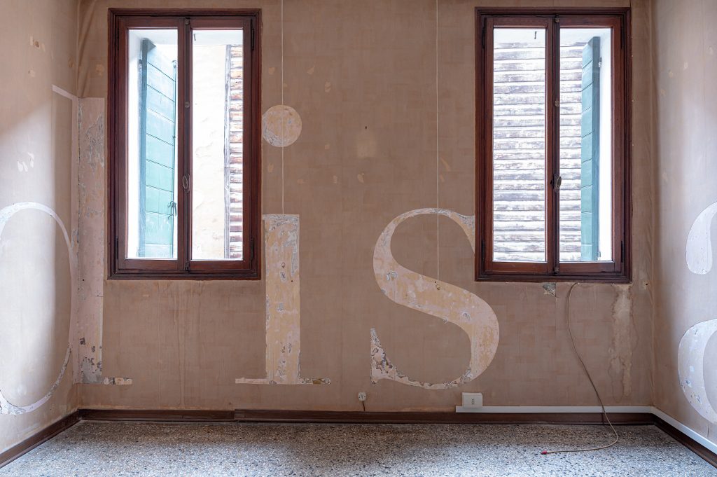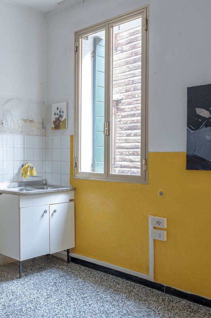 L’appartamento, al primo piano e di circa 90 metri quadrati, si presenta quasi completamente spoglio, in una fase pre-cantiere. È proprio questa condizione di verità a permettere alla mostra di dare allo spazio una vita nuova e temporanea, simile a un’occupazione poetica prima della trasformazione. La casa, liberata dagli arredi del passato, sembra indossare una nuova maschera, in dialogo diretto con il periodo attuale del Carnevale veneziano, di cui la Colombina è figura simbolica e protagonista.