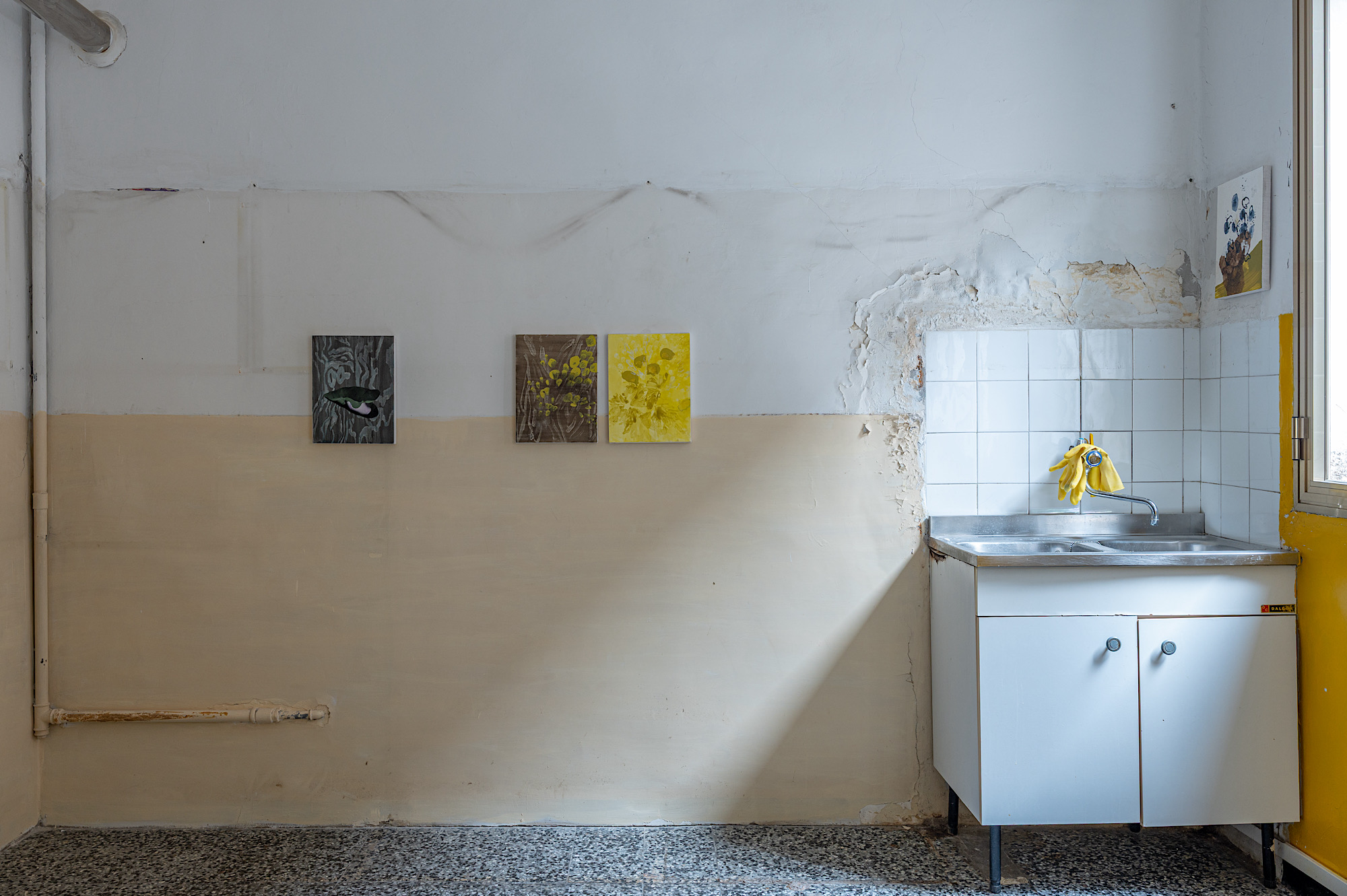 Ogni artista si insedia in una stanza diversa. Stefania Serio occupa l’ex cucina con una serie di dipinti astratti che evocano forme organiche e richiami al cibo, lasciando spazio a memorie personali e collettive legate ai gesti quotidiani e alla dimensione familiare. Le opere dialogano con ciò che resta della cucina, ovvero il lavello e le tubature, costruendo un ambiente sì riconoscibile ma rielaborato, sospeso tra funzionalità pratica e immaginazione.