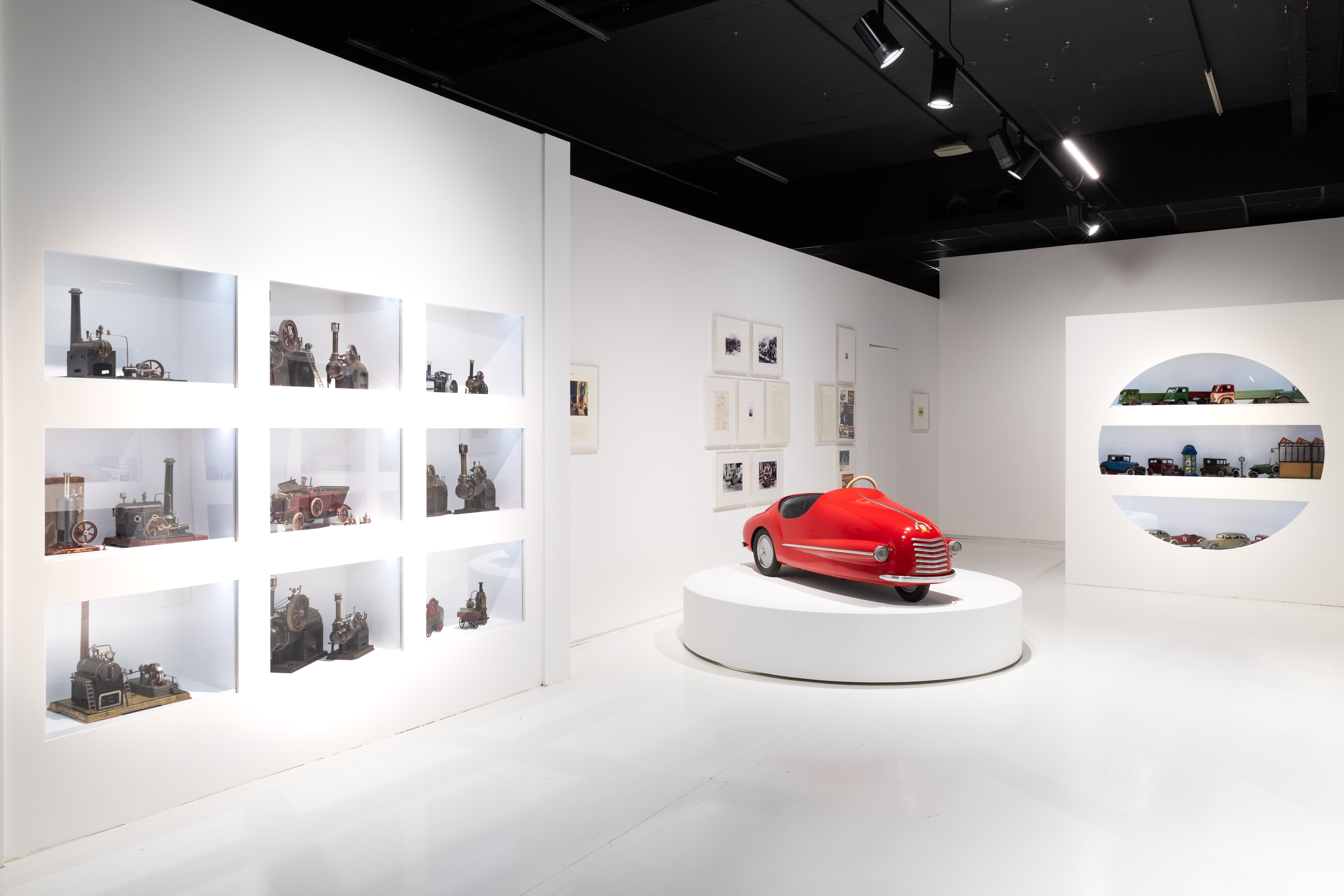 Il percorso espositivo ricostruisce con perizia uno spazio simile a una sorta di vecchio magazzino in cui manufatti e creazioni che riguardano il mondo dell’automobili sono posti l’uno accanto all’altro, proprio come se fossero in una vecchia soffitta gremita di polvere e ricordi. Ci sono automobiline, macchine e altri oggetti inerenti di tutte le dimensioni e di varie fogge e materiali, esposti l’uno accanto all’altro, a volte volutamente accatastati con l’intento di esaltarne un’insospettata dimensione auratica. Ne nasce un display che ha qualcosa di pittorico in sé stesso, curato nei colori e nelle corrispondenze delle forme, proprio come se ci trovassimo al cospetto di una scenografia.